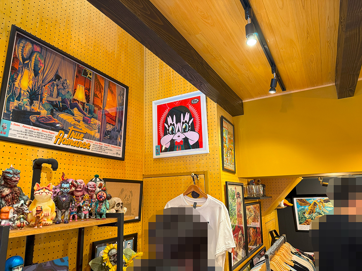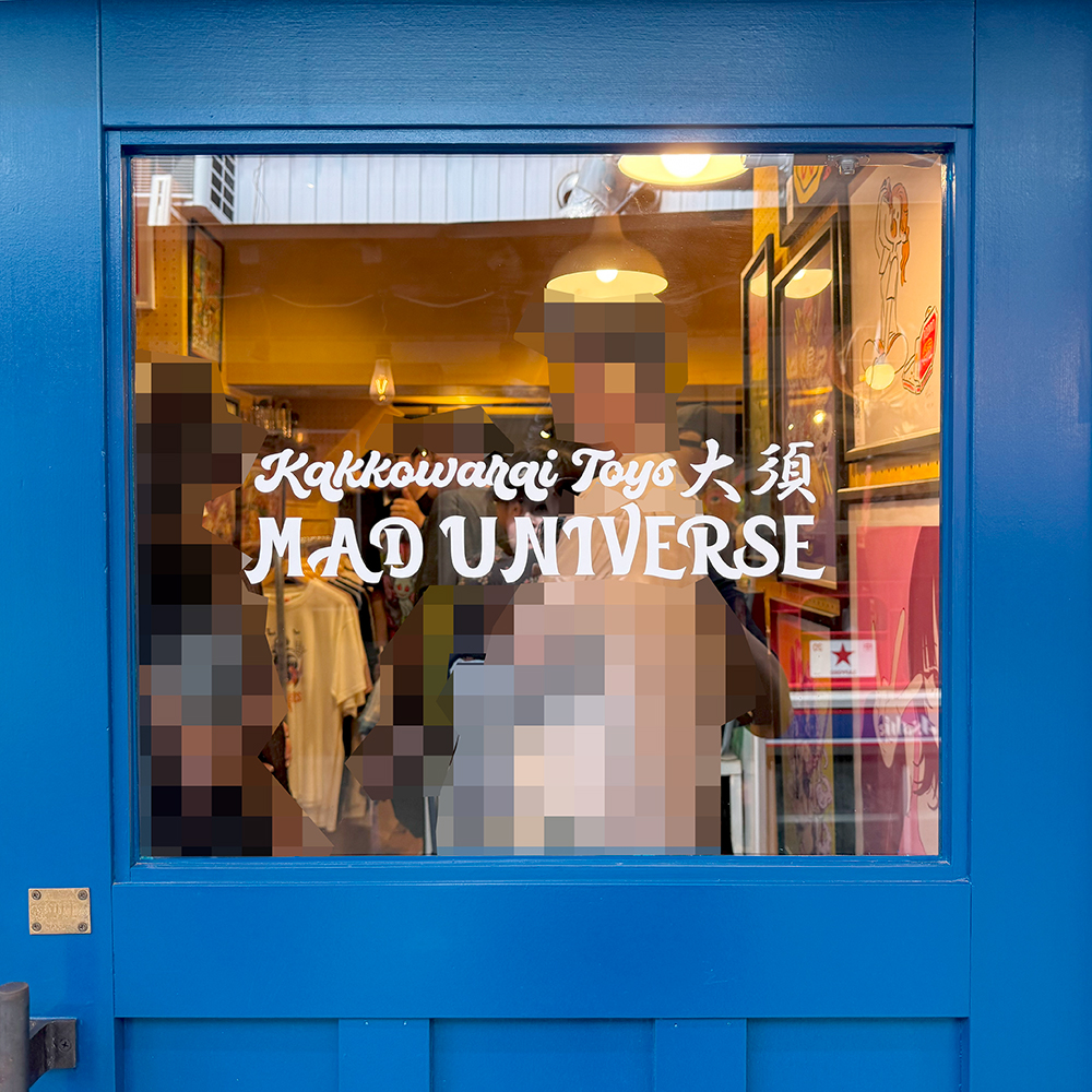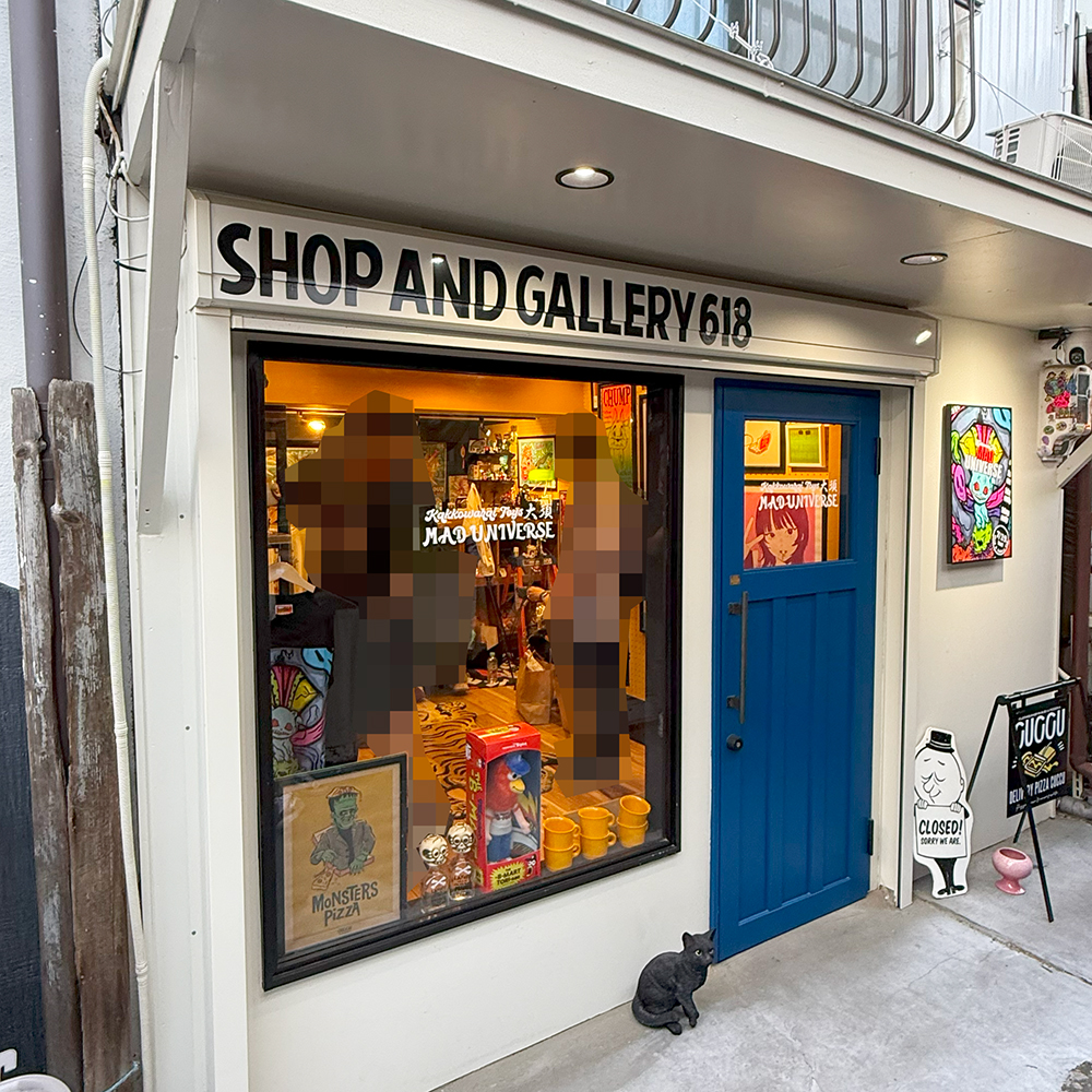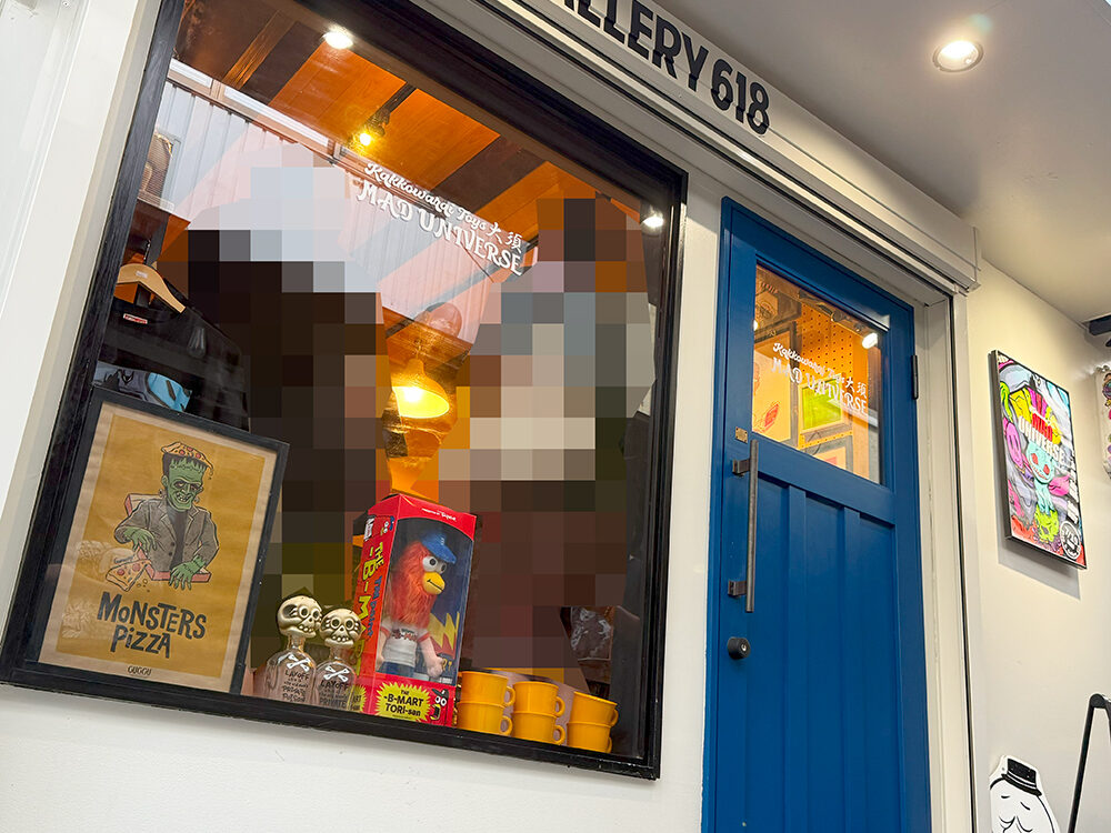 とげ男さんのお店”SHOP AND GALLERY 618”は雰囲気があってアートを感じるオシャレな店舗です🥰 白い壁に青いドア、そして店頭には可愛い黒猫ちゃん(オブジェです)がお座りしてお出迎え🥰 今回の個展はTAMAが主役ですので店頭の黒猫がとても親和性がある感じがしました🤔 またドアの右横には個展のメインビジュアルが展示されていて凄く目を引きますね😍 それにしても”あのTAMA”、MAD UNIVERSEのカラーリングのTAMA… 凄く魅力的ですよね~🥰 ”あのTAMA”は抽選販売でしたので、くじ運がない僕としては不安しかない…😭