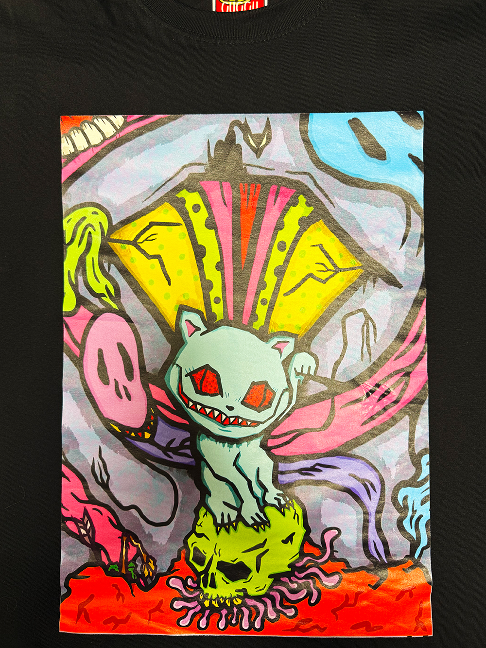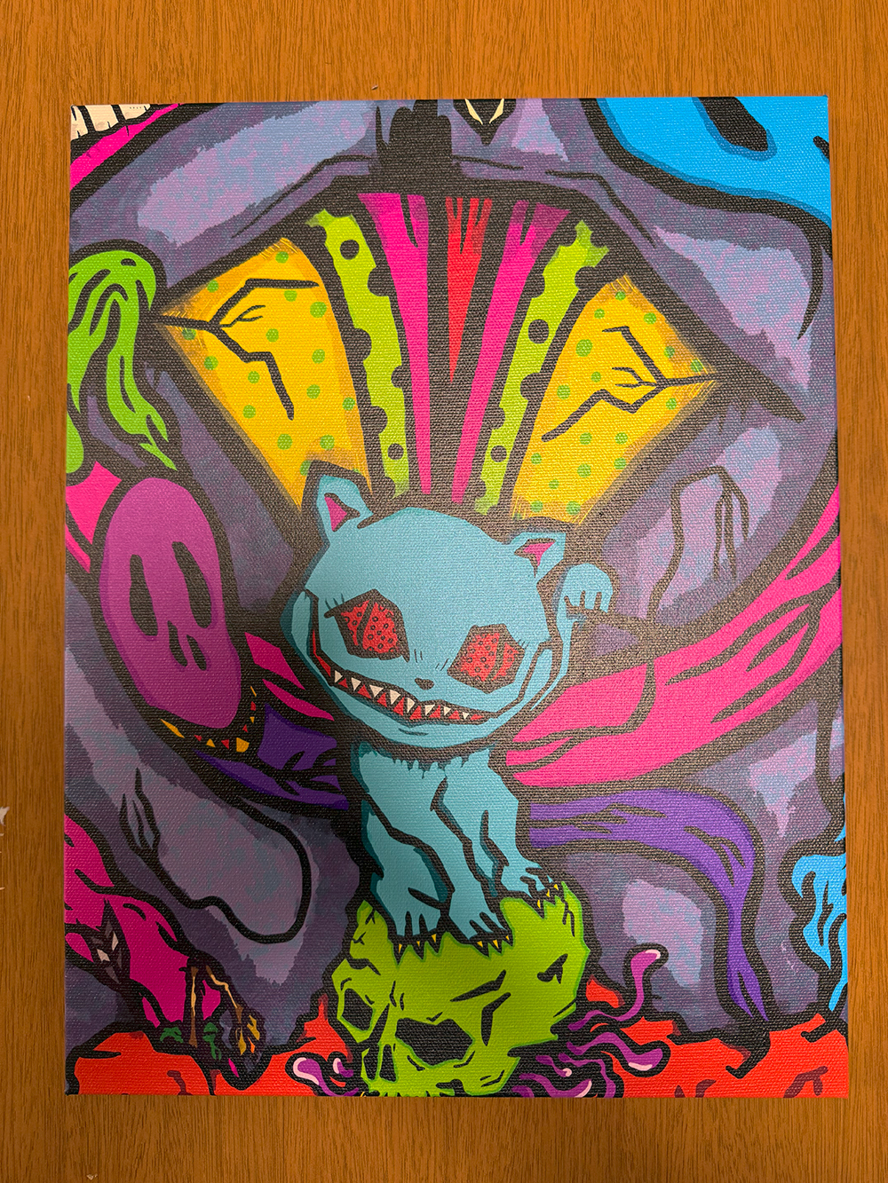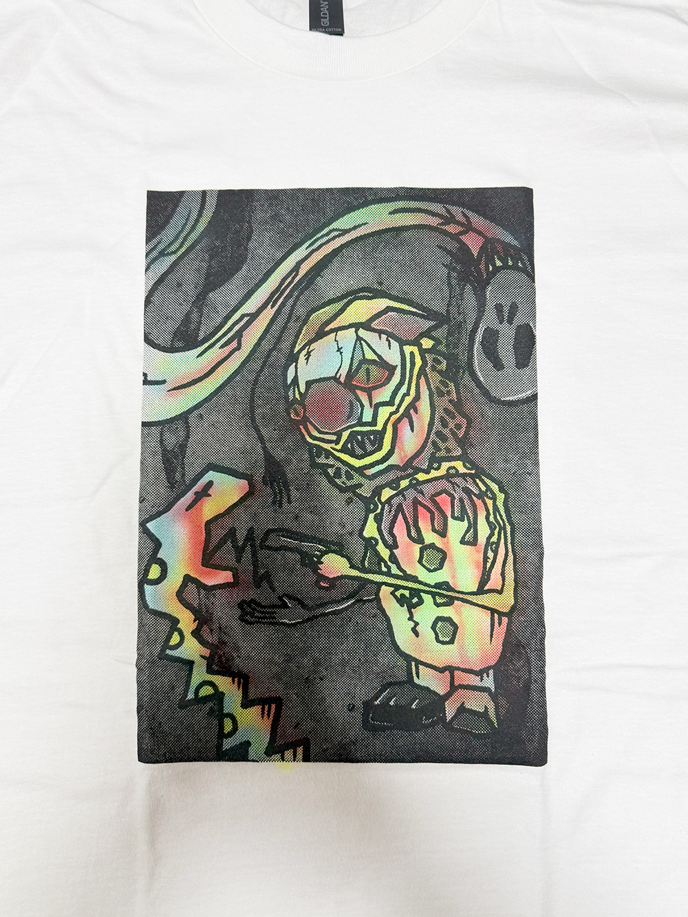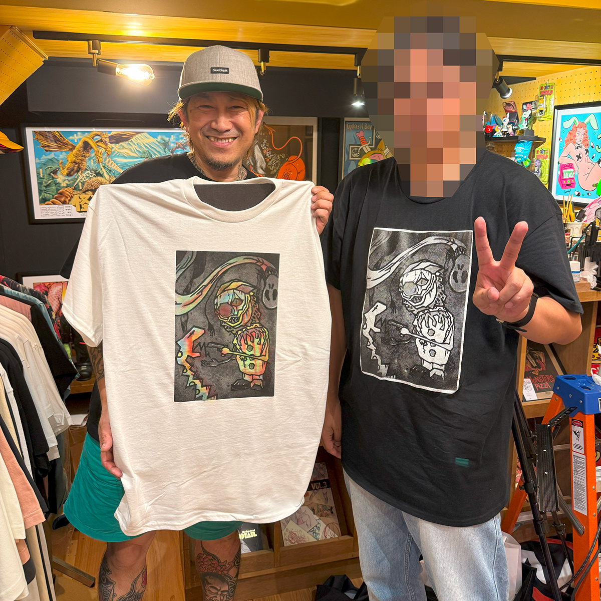 MAD UNIVERSEカラーの”TAMA”は届くまで少し待つとして… その他3点の作品を購入しました🥰 1つ目は「メインビジュアルがプリントされたTシャツ」です😊 「SHOP AND GALLERY 618」とげ男さんのブランドから発売している本個展の限定Tシャツでカラープリントが鮮やかなデザインです🤔 カッコいいですよね~ 早速着て出かけました🥰 そして2つ目は「エアブラシペイントのポッくんTシャツ(白)」です🥰 櫻井さんの塗装を間近で見れるという貴重な体験とともに、世界で1つの僕だけのTシャツを手に入れました😭 そして3つ目は絵画作品になります😊 なんとキャンバスアートです🥰 僕自身キャンバスアート自体を初めて購入しましたが、部屋に飾ると”かこわらワールド”全開という感じですね🤔 ソフビとともに自分好みの雰囲気を楽しめる絵画作品もいいものですね🥰 汚しちゃいけないということで、キャンバスアート用の額を購入して、届くのを待っているところです😅 これが届いたら正式にソフビ棚の横に設置したいと思います🥰