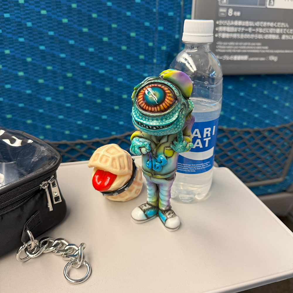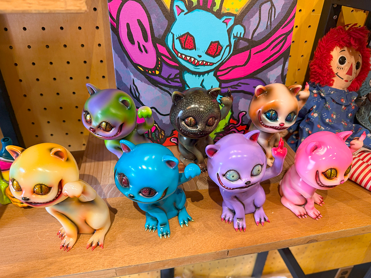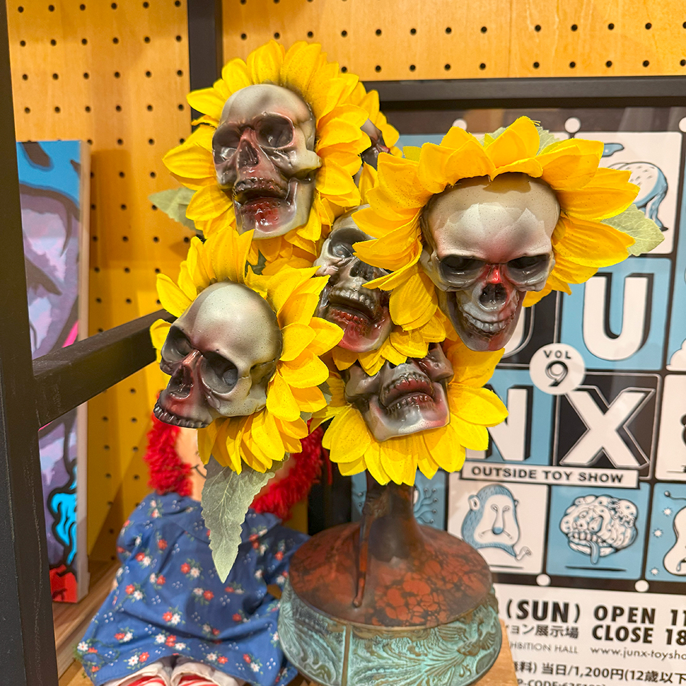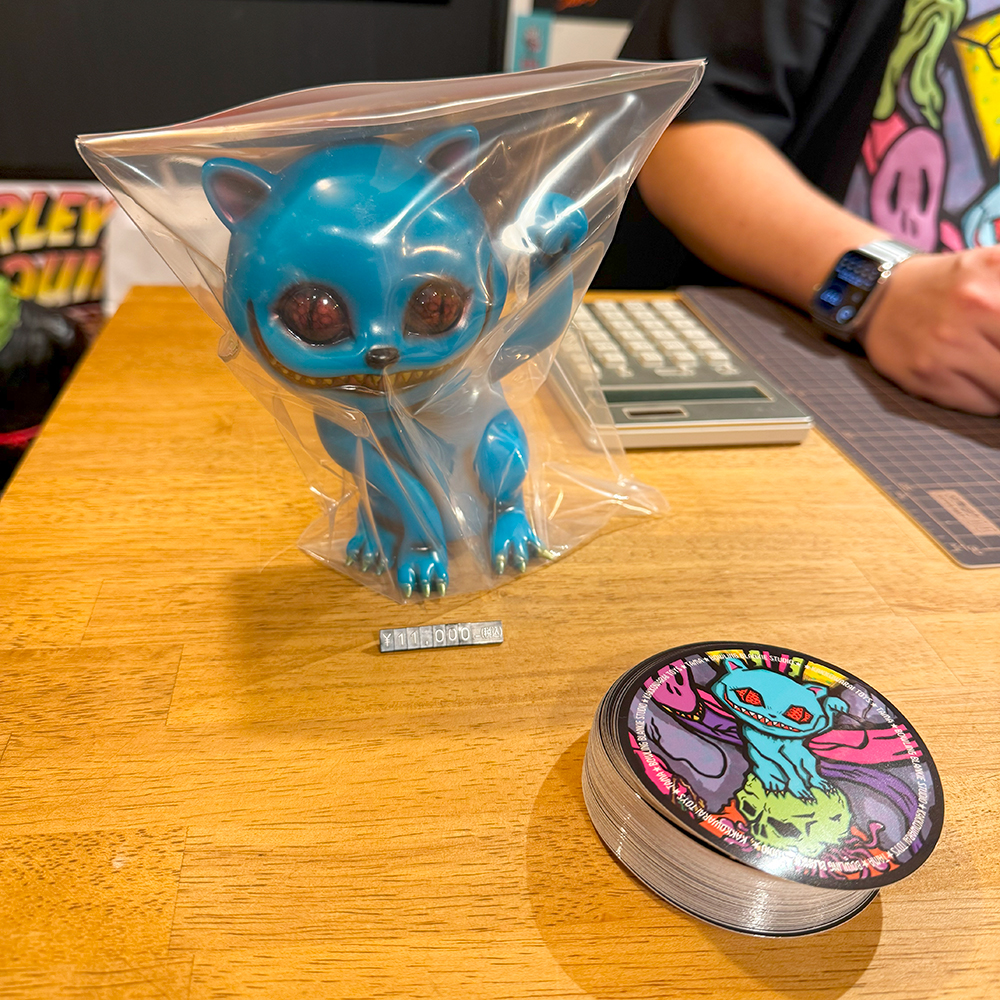 僕は下北沢の”MAD UNIVERSE”にもお伺いしていますので、そこでも作品をじっくり見ているのですが、何度見ても凄いものは凄い😲 まるで初めて見るかのごとく、またじっくりと拝見しました🥰 その中でも注目はやっぱりTAMAのラインナップです😊 今回さらにバリエーションが大幅に増えて展示されていました!まず気になったのは”黒猫”です😲 よく見るとただの黒い塗装ではなく斑模様やウニョウニョ柄が施されていて怖さと迫力があります😱 次に気になったのはパープルの2体です🤔 1つは猫目でパープルと毒々しいグリーンのコーディネーション、もう1つはゾンビ眼で招くのではなく中指を立てています😵 1つのキャラクターでこんなにも多彩に変化できるとは… それもTAMAの魅力の1つだと思います🥰 そしてもう1つの注目は”メデューサ”です。次の新作ということで、前回の下北沢の時はグリーン系の作品が展示されていましたが、今回の大須ではブルー系のカラーが増えていました🤔 ファーストカラーは2色なのか?楽しみですね🥰