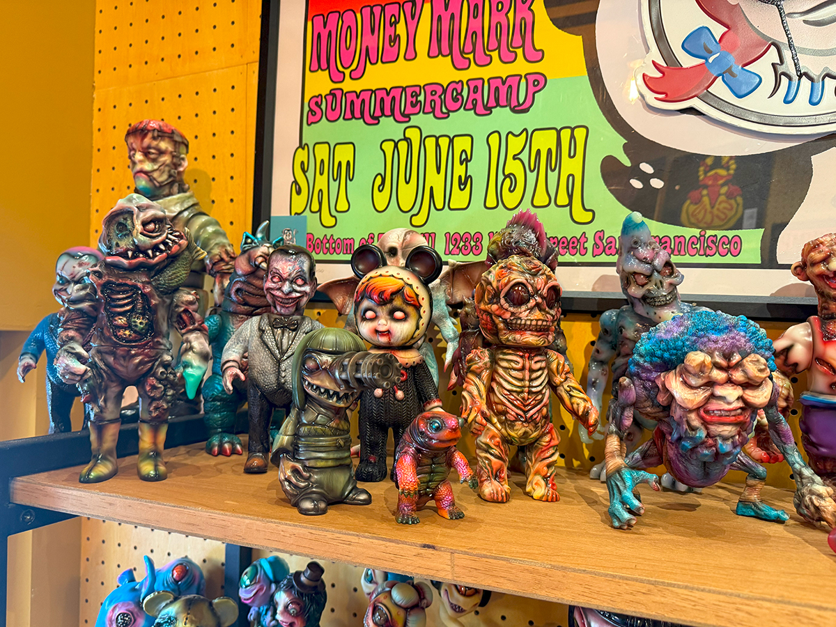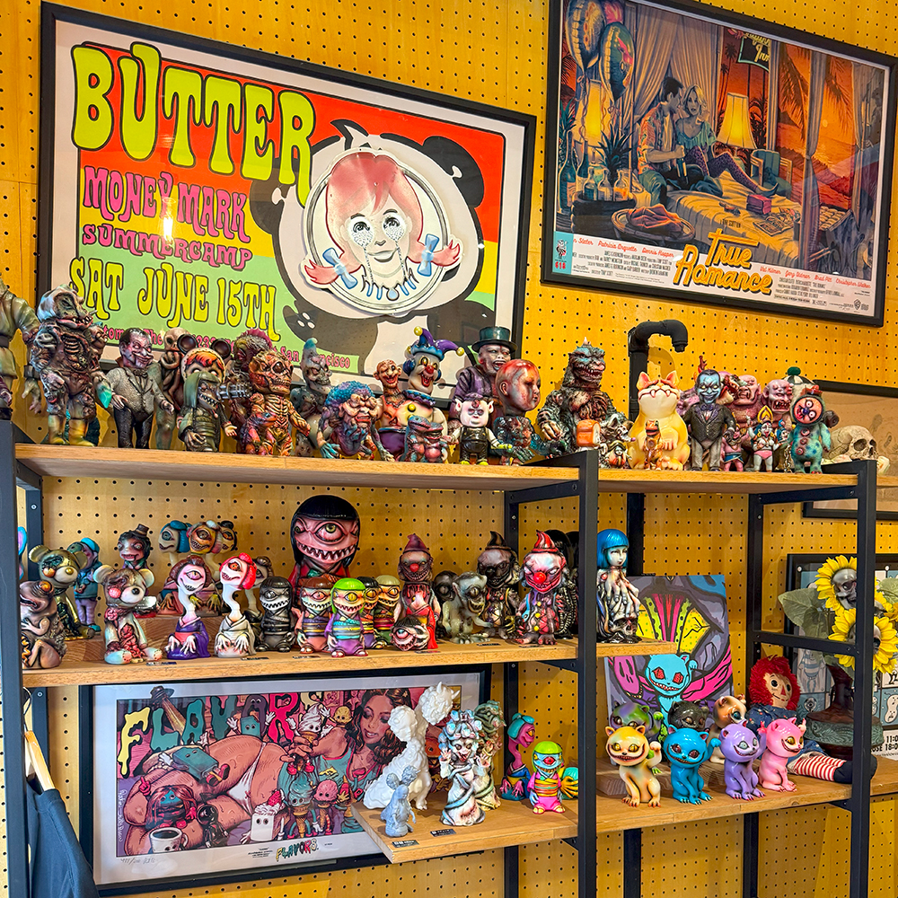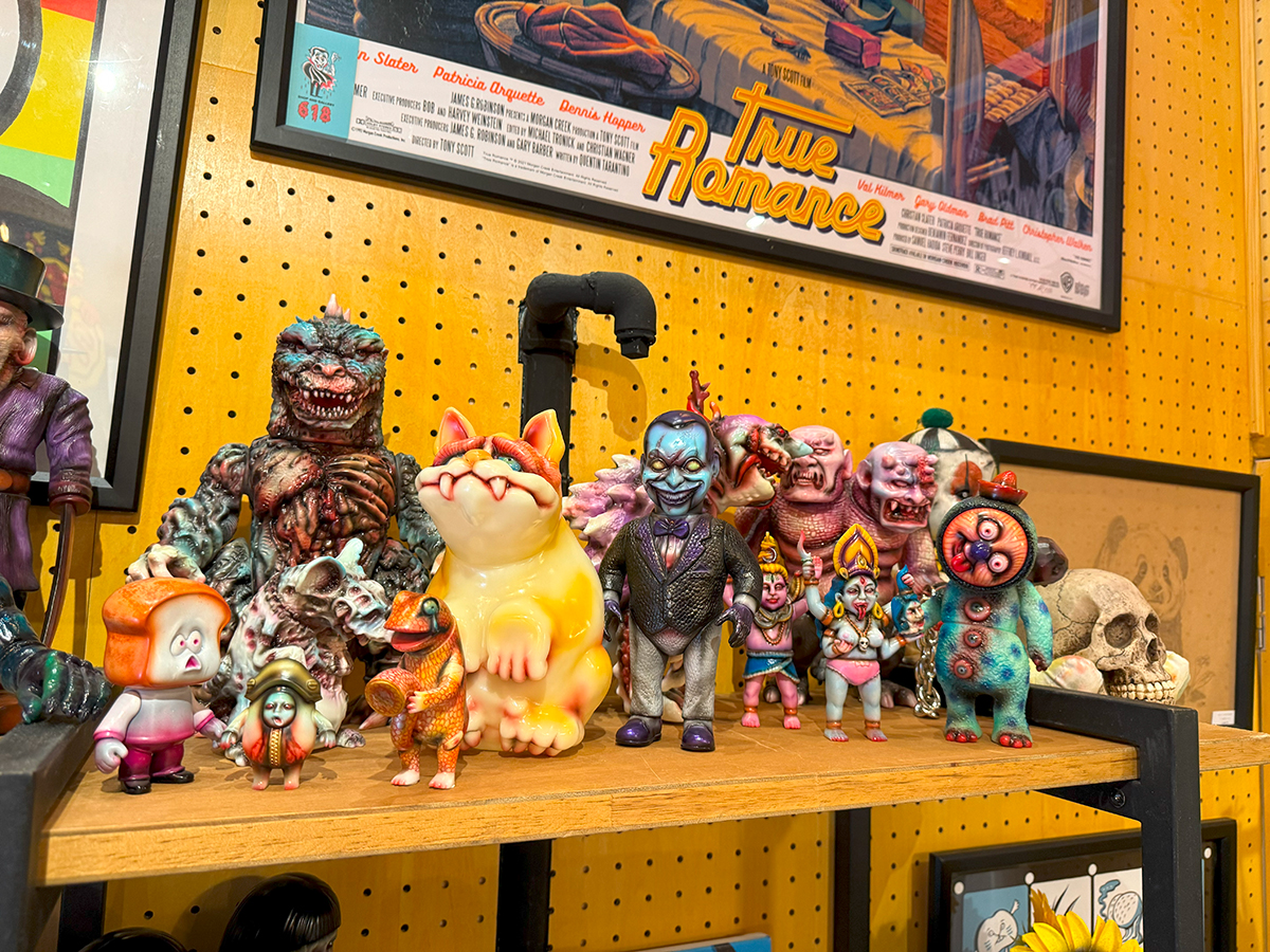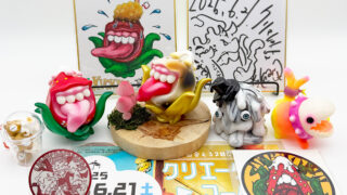 僕は下北沢の”MAD UNIVERSE”にもお伺いしていますので、そこでも作品をじっくり見ているのですが、何度見ても凄いものは凄い😲 まるで初めて見るかのごとく、またじっくりと拝見しました🥰 その中でも注目はやっぱりTAMAのラインナップです😊 今回さらにバリエーションが大幅に増えて展示されていました!まず気になったのは”黒猫”です😲 よく見るとただの黒い塗装ではなく斑模様やウニョウニョ柄が施されていて怖さと迫力があります😱 次に気になったのはパープルの2体です🤔 1つは猫目でパープルと毒々しいグリーンのコーディネーション、もう1つはゾンビ眼で招くのではなく中指を立てています😵 1つのキャラクターでこんなにも多彩に変化できるとは… それもTAMAの魅力の1つだと思います🥰 そしてもう1つの注目は”メデューサ”です。次の新作ということで、前回の下北沢の時はグリーン系の作品が展示されていましたが、今回の大須ではブルー系のカラーが増えていました🤔 ファーストカラーは2色なのか?楽しみですね🥰