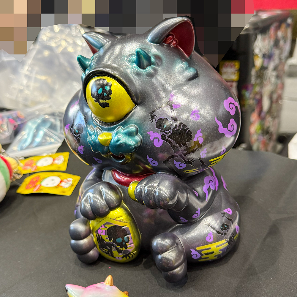 2つ目はかっこわらい雑貨店さんのタマ”Gold”です🥰 金色の身体にミステリアスで綺麗な眼が特徴的な招き猫のタマで、神々しさと恐ろしさを併せ持つ不思議な雰囲気があります🤔 今までの作品よりも陰影が強めに施されているため、明るすぎない落ち着いたカラーリングになっていて、それが妖怪的でダークな印象を強めている気がします😲 また眼・耳・口だけでなく、陰影にも薄くブルーが使われているため全体的に色彩がマッチして見えます🥰 そして眼球や耳をよく見ると細かいドット柄が施されていて、特に眼力が強まって迫力が増しているように思います😱