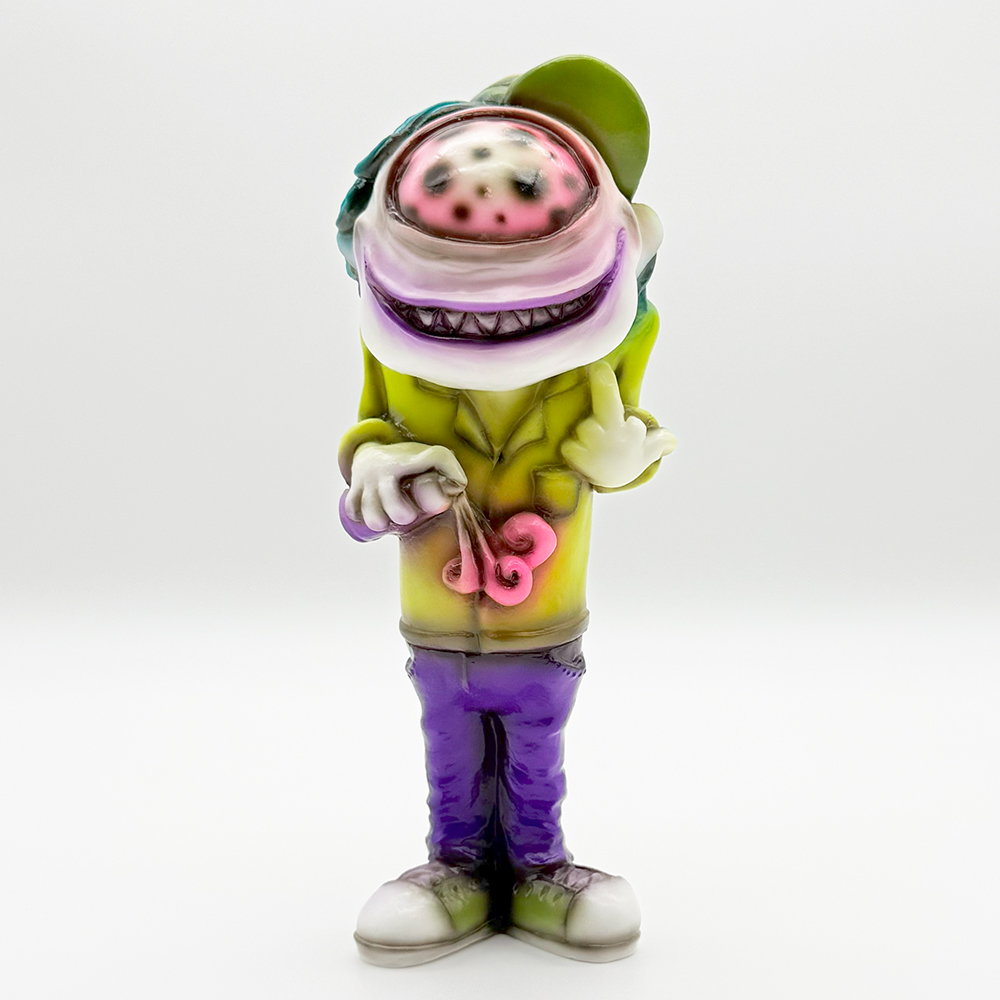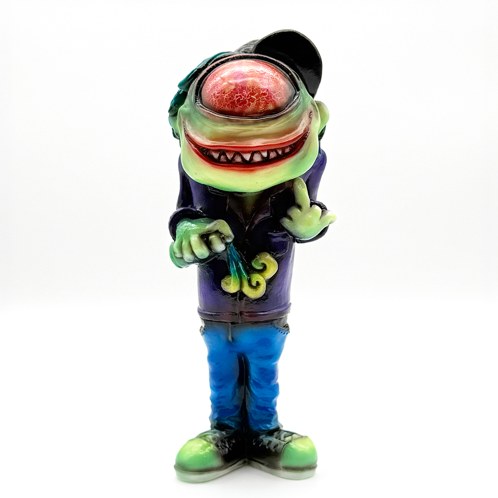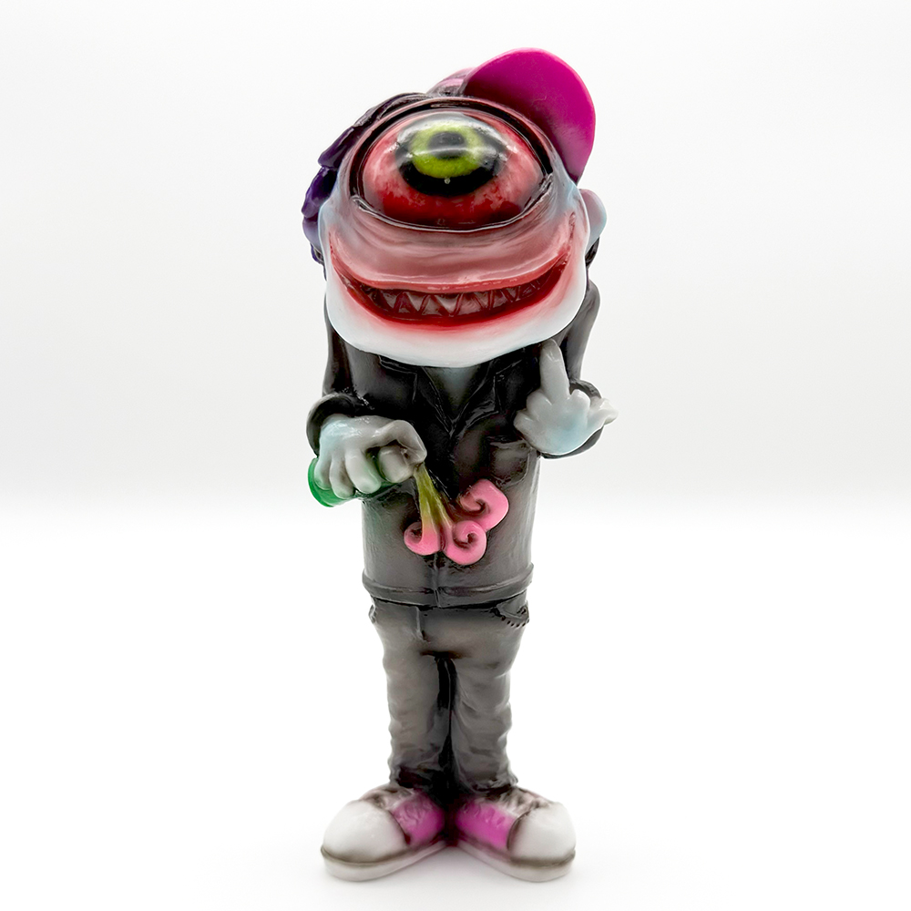「僕のことは心配いらないよ」そんなキャッチフレーズを持った悪い子「ジョーイ」。頭部の半分以上を占める大きな目玉と悪そうな口が特徴的なキャラクターです😱 恐ろしさを醸し出しながらもどこか幼さも残す姿と表情ですが、右手に持ったスプレーが気になるところです… 落書き用のスプレーなのか、それとも有毒ガスを含んだスプレーなのか…?かっこわらい雑貨店さんの独特の塗装が恐ろしさと怪しさを存分に表現しています😊