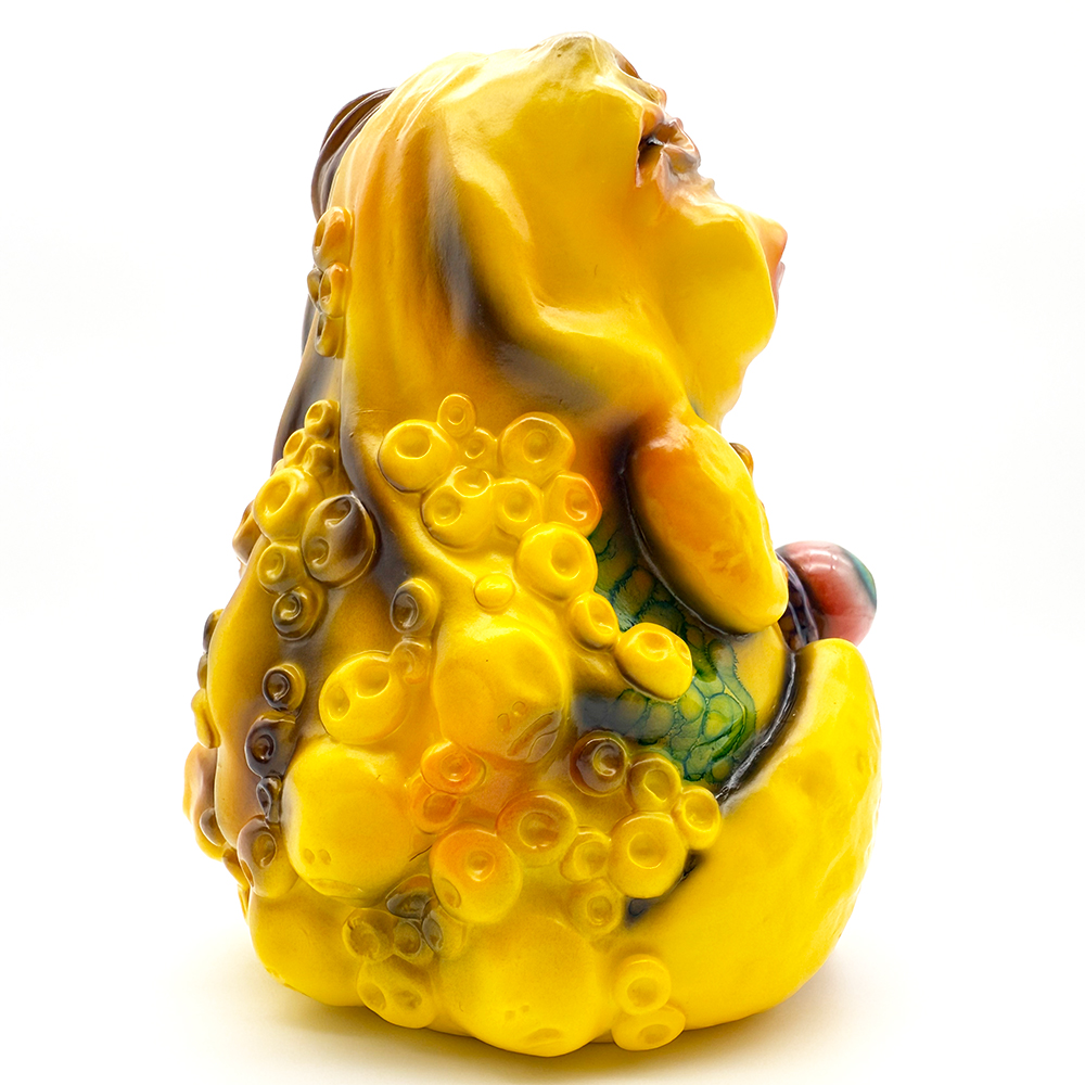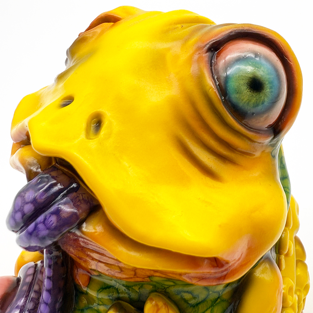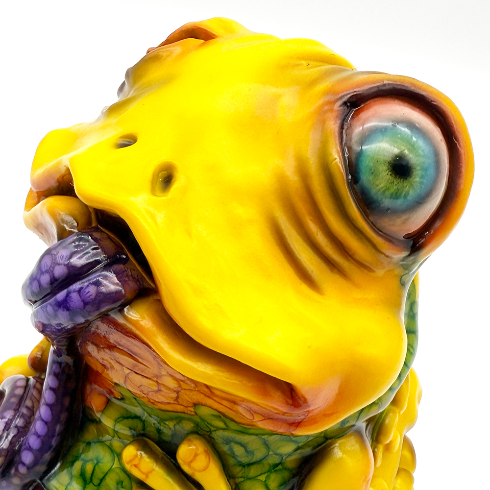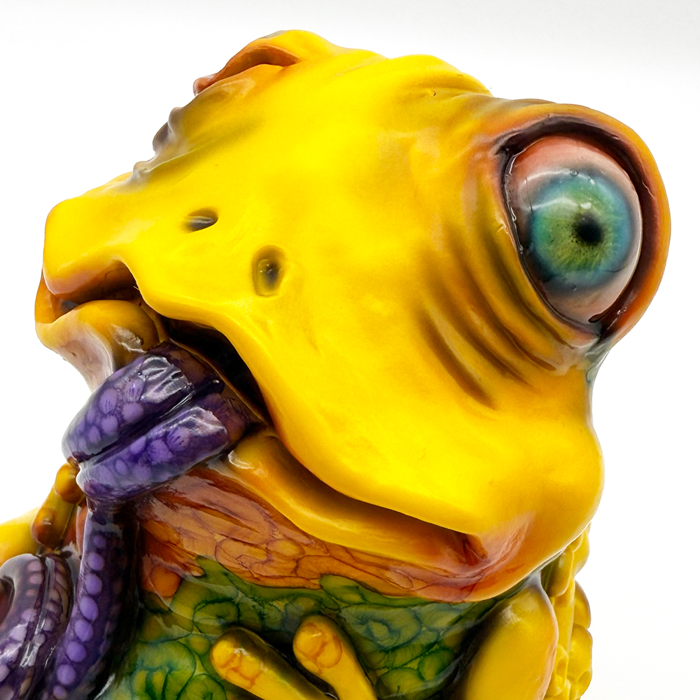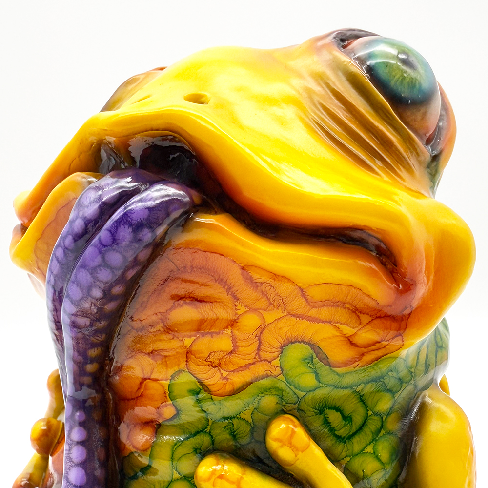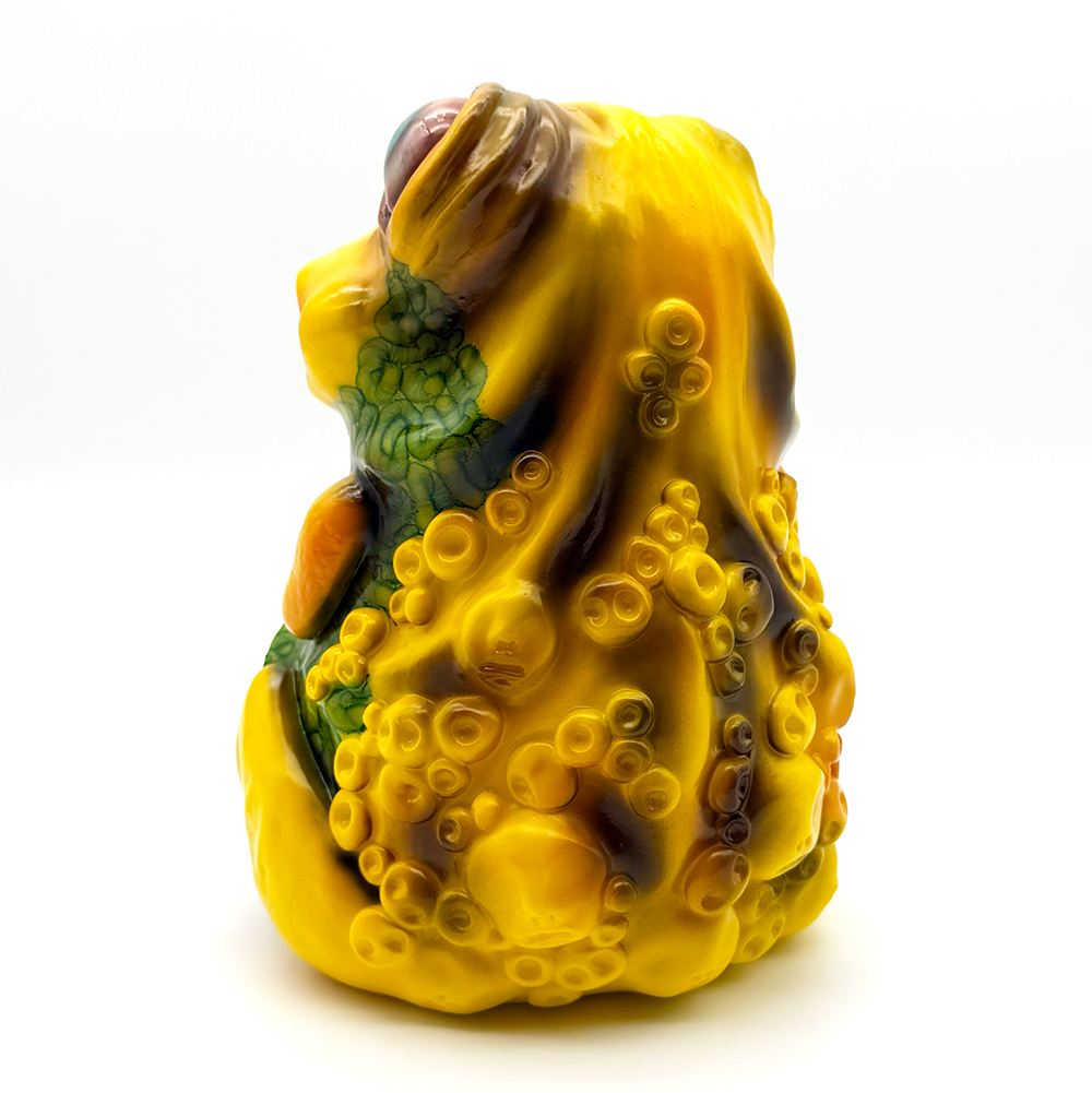 ”ワンコン Vol.5”でお迎えしたレミーです🥰 身体全体の黄色は陰影や汚し加減が凄く良い味を出しています😍 そして赤と緑のウニョウニョ柄がまるで細菌か何かに感染して浸食されている… または臓器が飛び出して拡散しているようにも見えます😭 舌は紫ドット柄がキモく今にも動き出しそう😱 表情は可愛らしいですが、モンスター要素がギッシリ詰まった、芸術的ホラーの凄みを見せてくれる豪華なレミーです😊