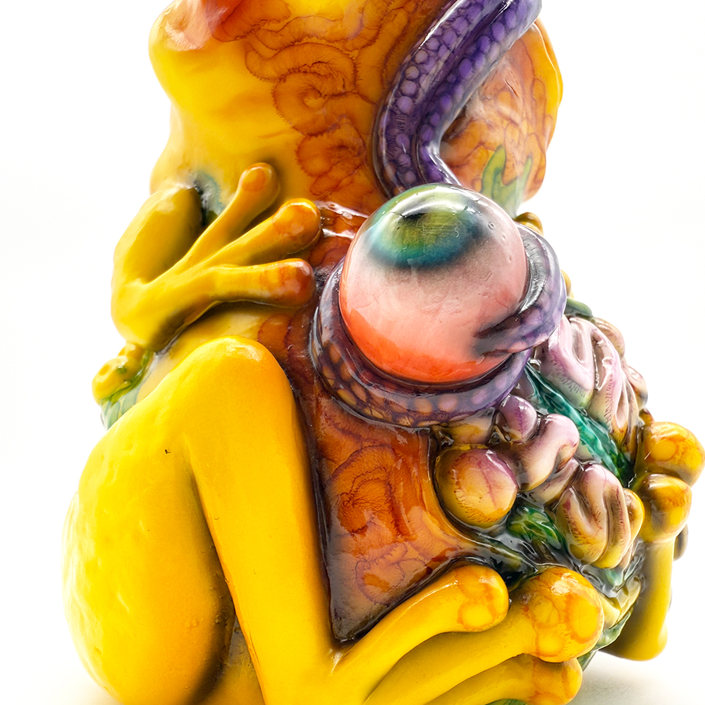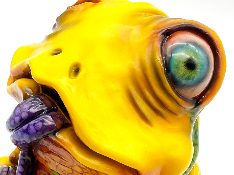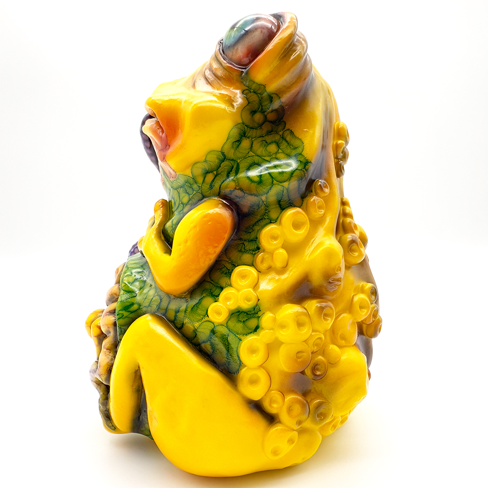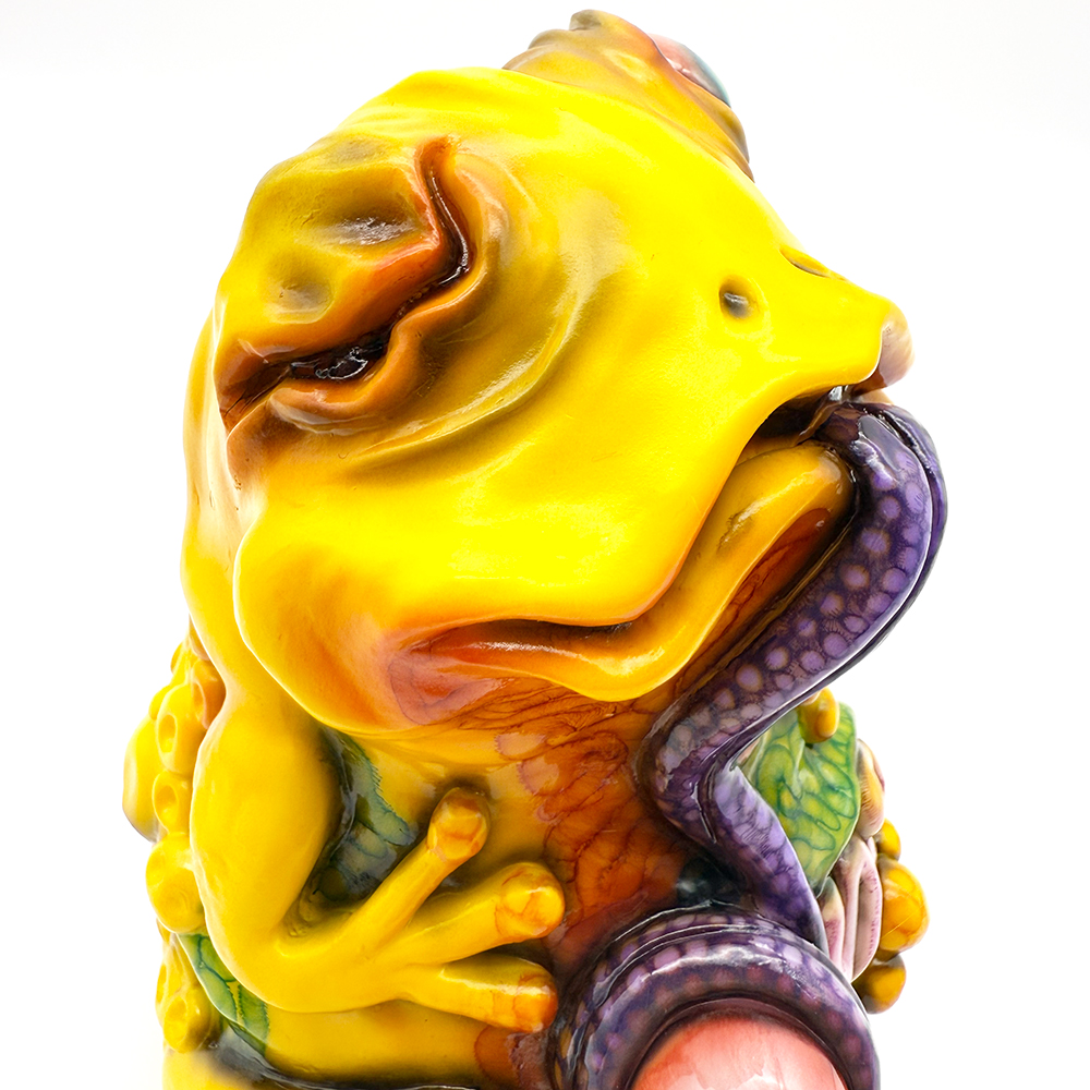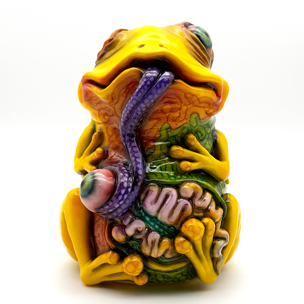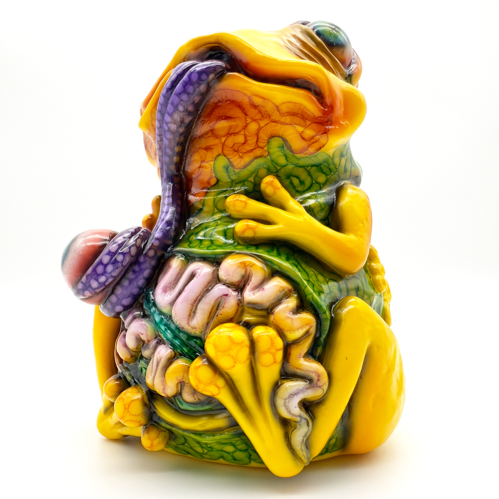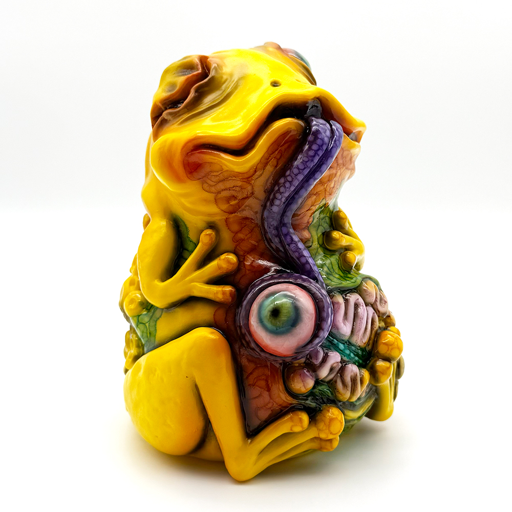 ”ワンコン Vol.5”でお迎えしたレミーです🥰 身体全体の黄色は陰影や汚し加減が凄く良い味を出しています😍 そして赤と緑のウニョウニョ柄がまるで細菌か何かに感染して浸食されている… または臓器が飛び出して拡散しているようにも見えます😭 舌は紫ドット柄がキモく今にも動き出しそう😱 表情は可愛らしいですが、モンスター要素がギッシリ詰まった、芸術的ホラーの凄みを見せてくれる豪華なレミーです😊