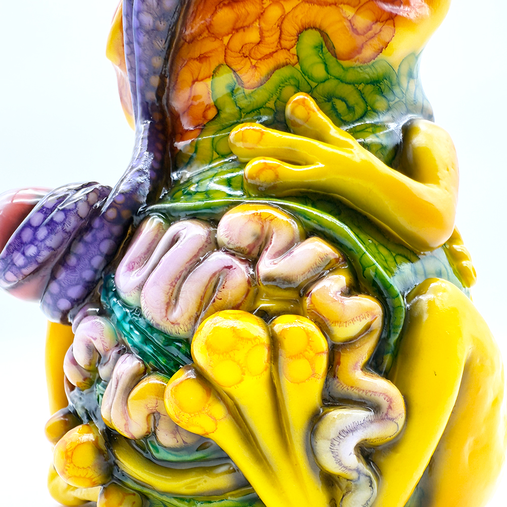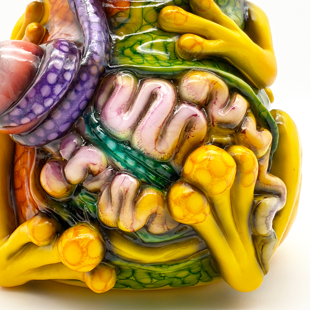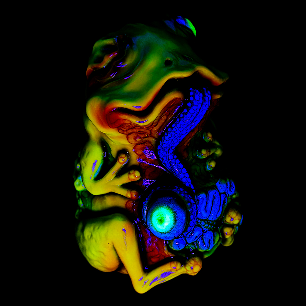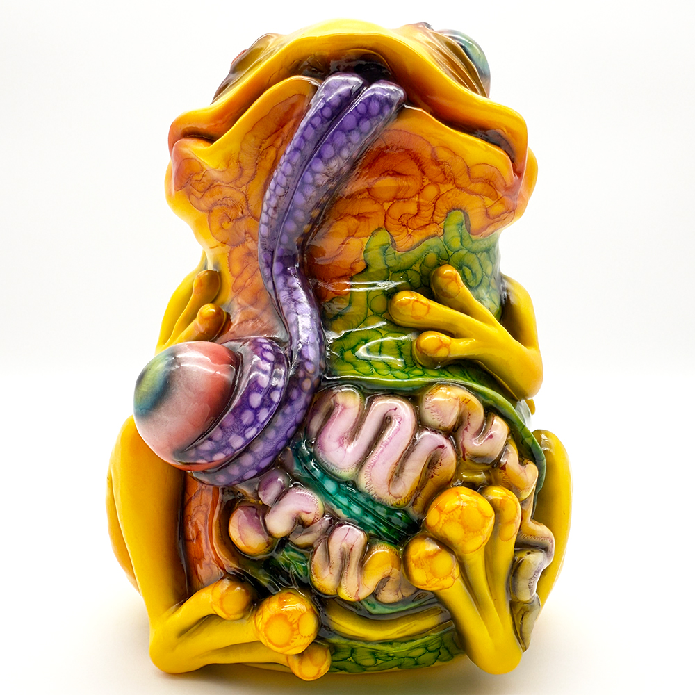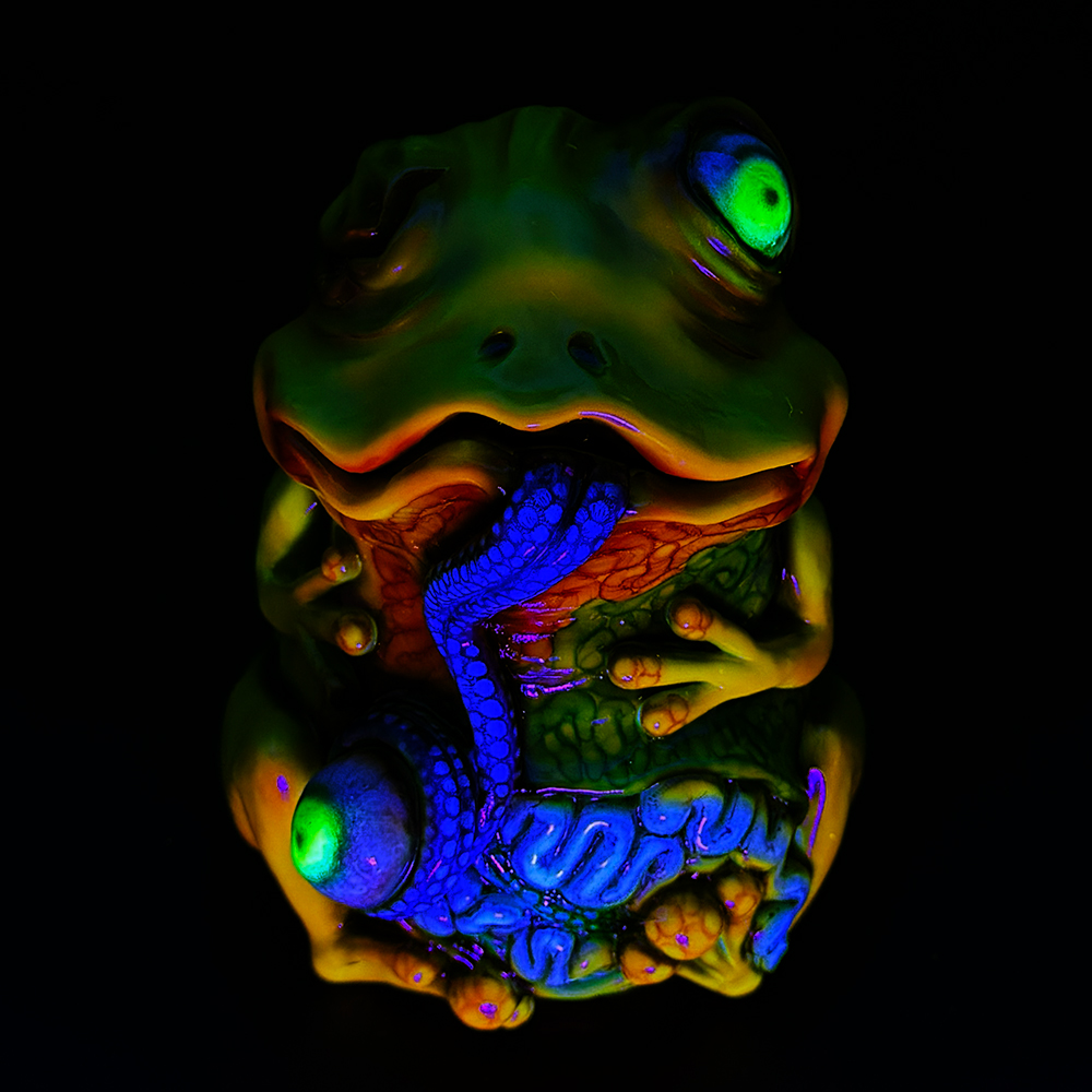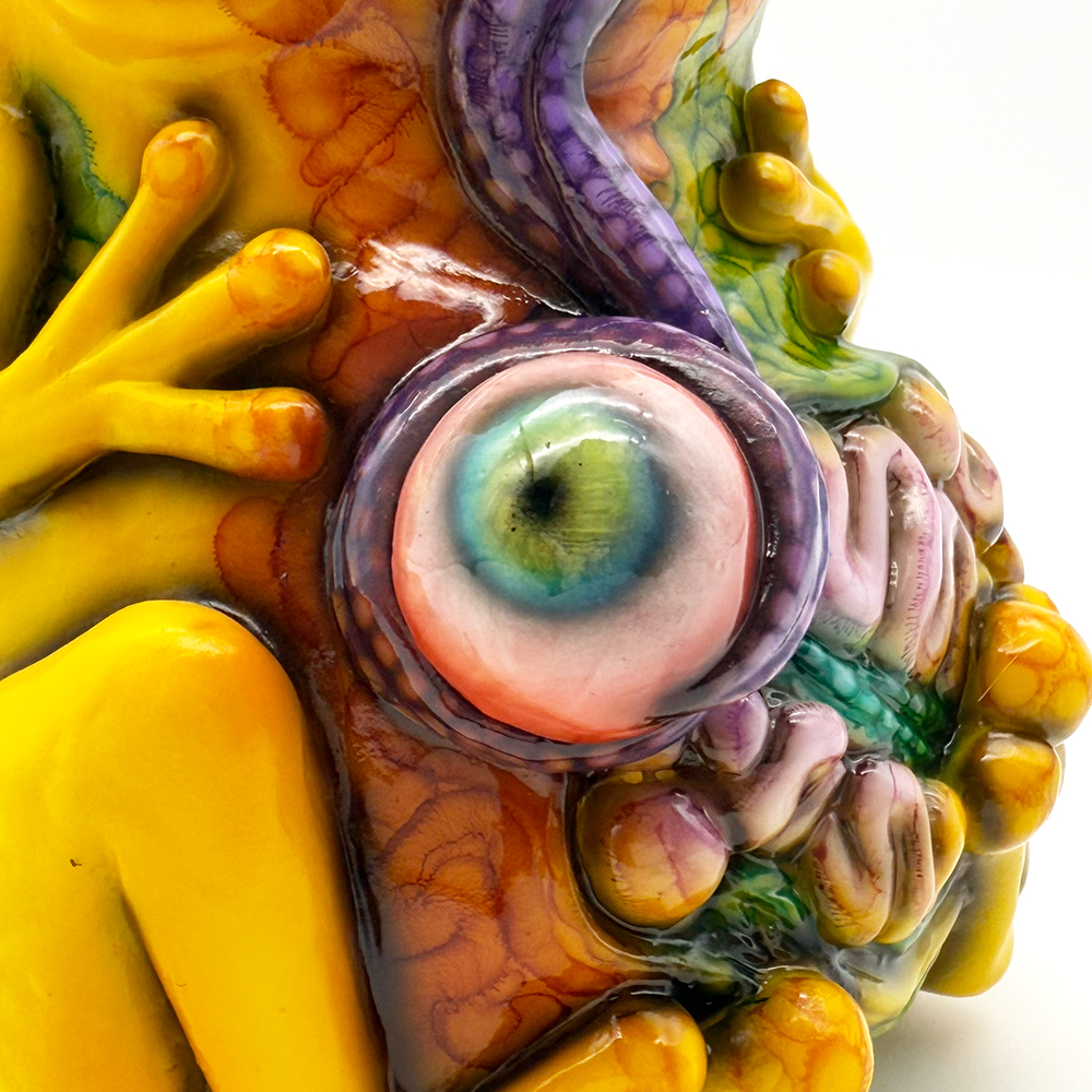 ”ワンコン Vol.5”でお迎えしたレミーです🥰 身体全体の黄色は陰影や汚し加減が凄く良い味を出しています😍 そして赤と緑のウニョウニョ柄がまるで細菌か何かに感染して浸食されている… または臓器が飛び出して拡散しているようにも見えます😭 舌は紫ドット柄がキモく今にも動き出しそう😱 表情は可愛らしいですが、モンスター要素がギッシリ詰まった、芸術的ホラーの凄みを見せてくれる豪華なレミーです😊
