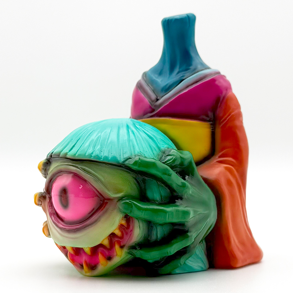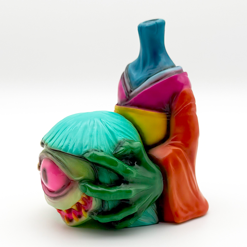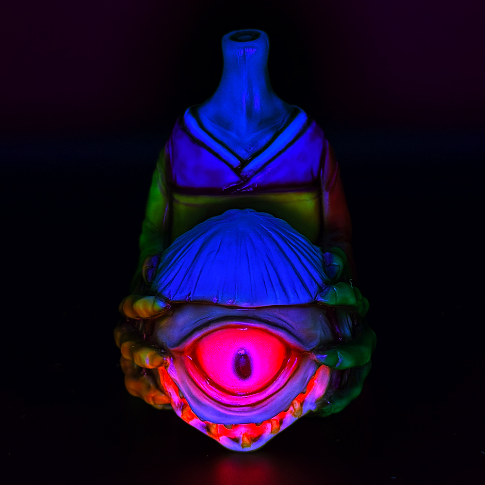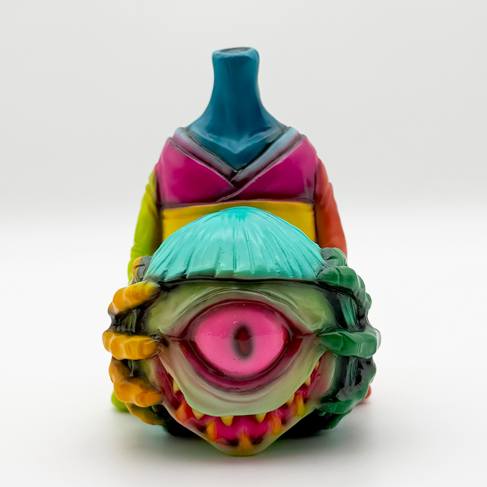 かっこわらい雑貨店さんの個展”MAD UNIVERSE”のメインビジュアルのイラストカラーのまちこです🥰 肌の色… 特に手がゾンビ感が超凄いです😱 さらに左右の手や首の色がそれぞれ異なっており、肌の色とは対照的にド派手な着物にも様々な色が使われています🤔全体的に「アートっぽさ」と「恐ろしい感じ」が共存した不思議な雰囲気を醸し出しています😊 そして暗闇では恐怖感が倍増😱 また違った雰囲気を楽しめます🥰