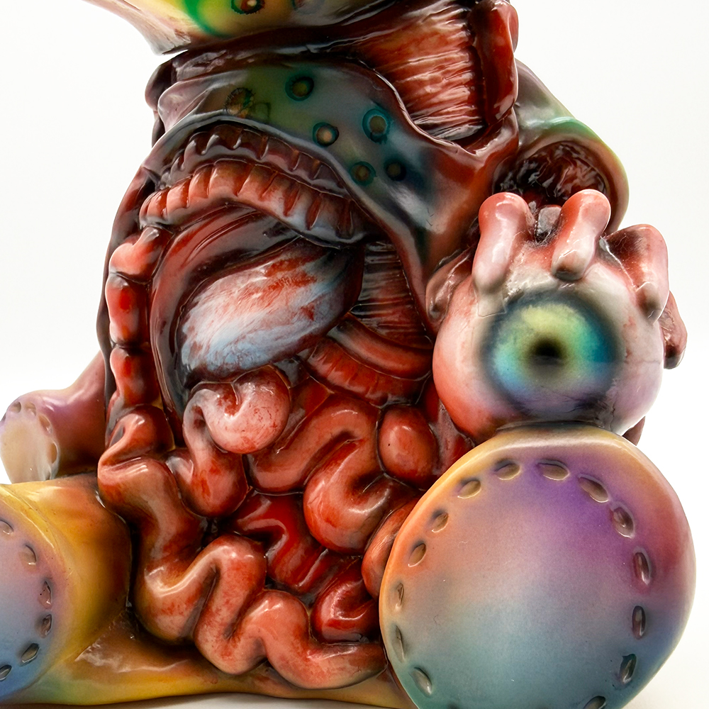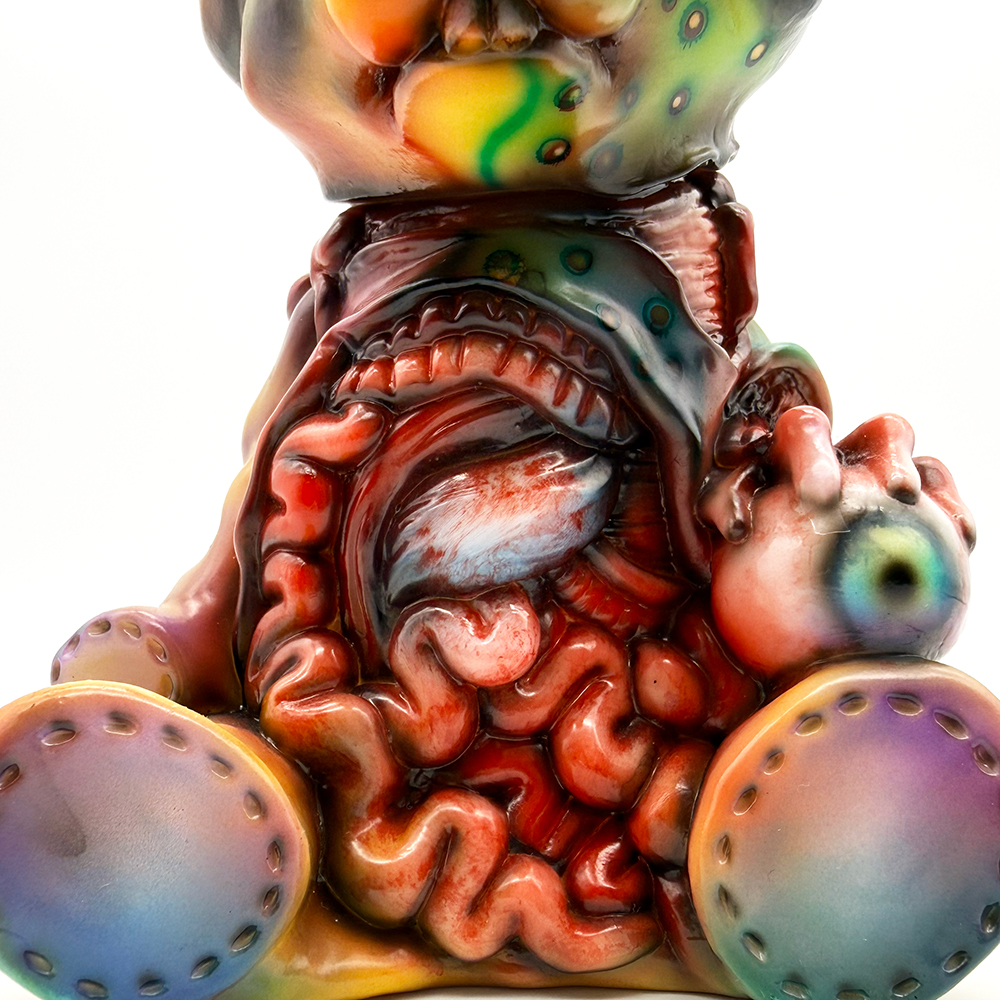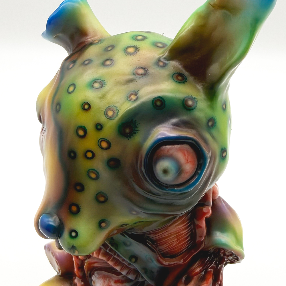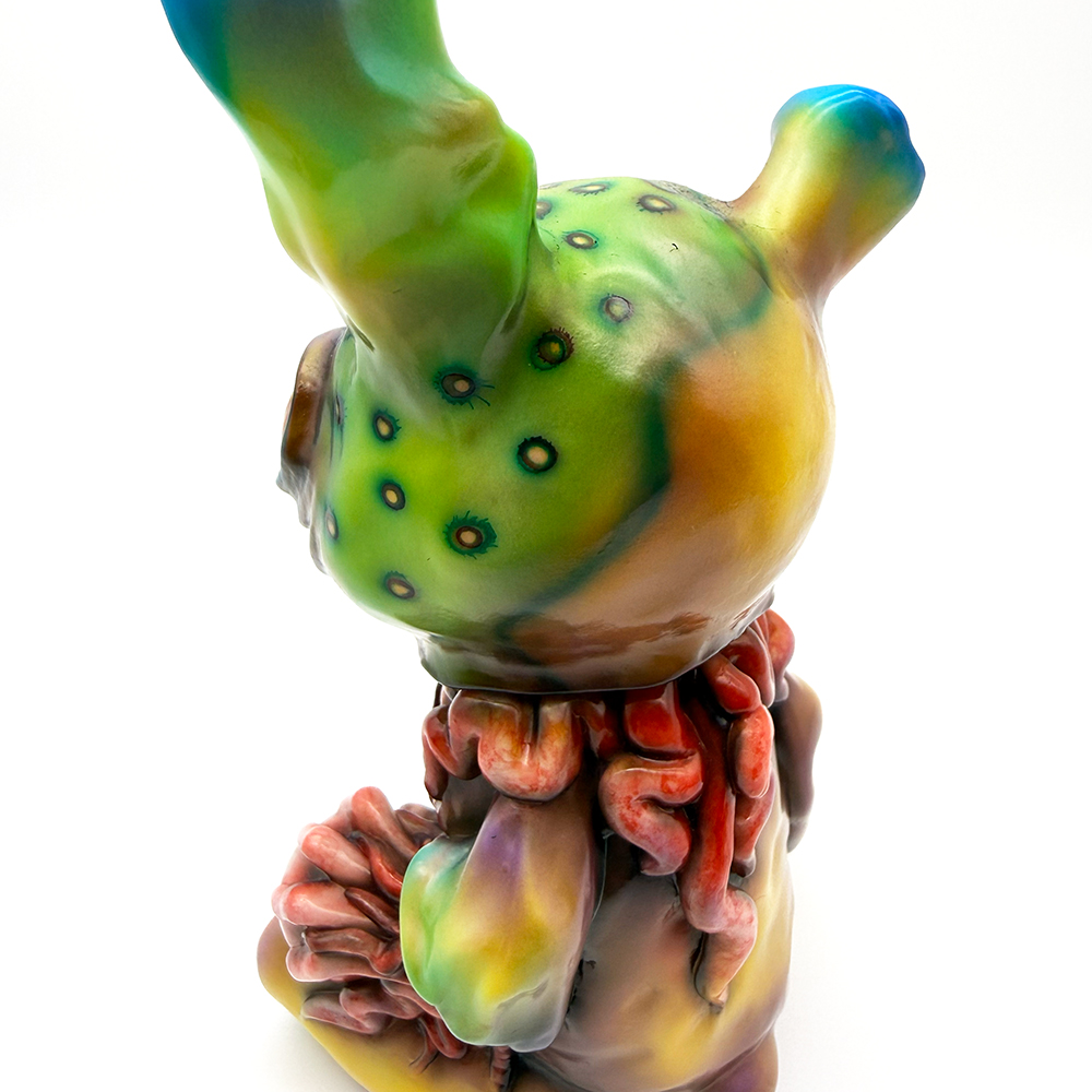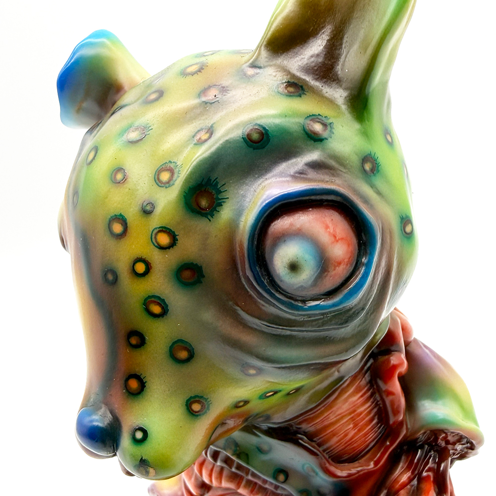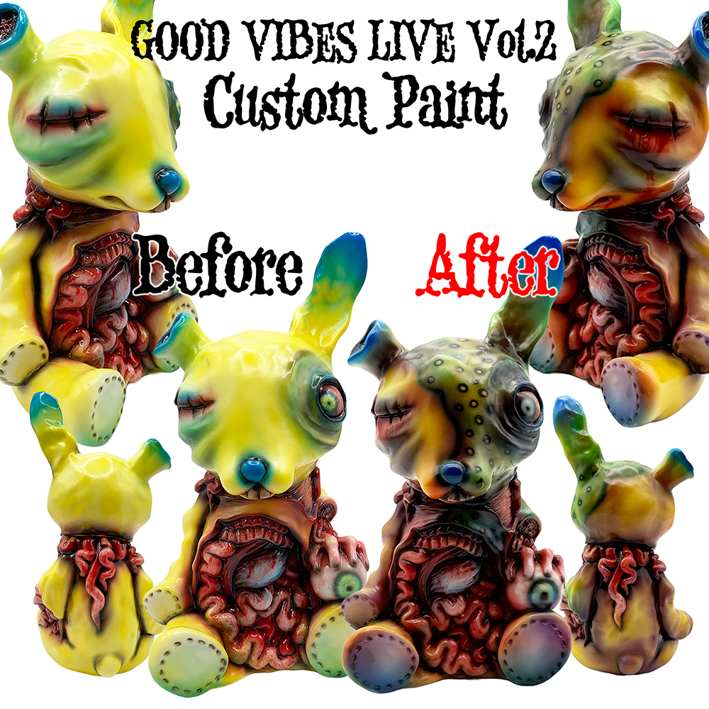 “GOOD VIBES LIVE Vol.2″でお迎えしたメロディはかっこわらい雑貨店の櫻井さんによるカスタムペイントバージョンです🥰 カスタムの要望は「血塗れでキモい要素も入れる」という内容で、ベースの雰囲気は若干残しつつ、顔の左半分が毒に侵されたような… ウィルスに感染したかのようにブツブツに爛れていて、さらに右側はボコボコに殴られたかのようにアザや血の跡が滲んでいます😱 さらに全身にも傷みがあり、ゾクッとくる感じに仕上がっています😍