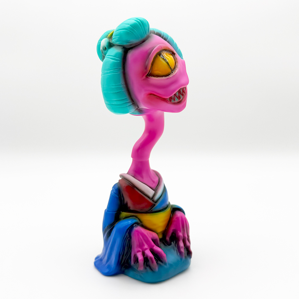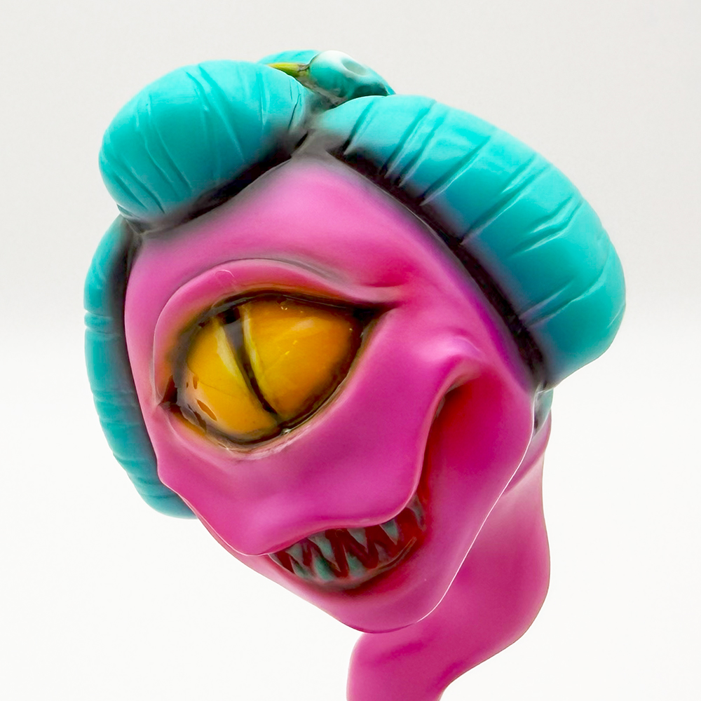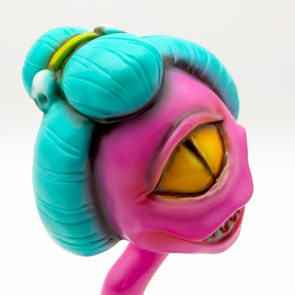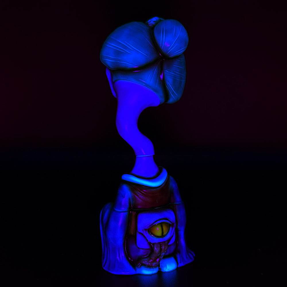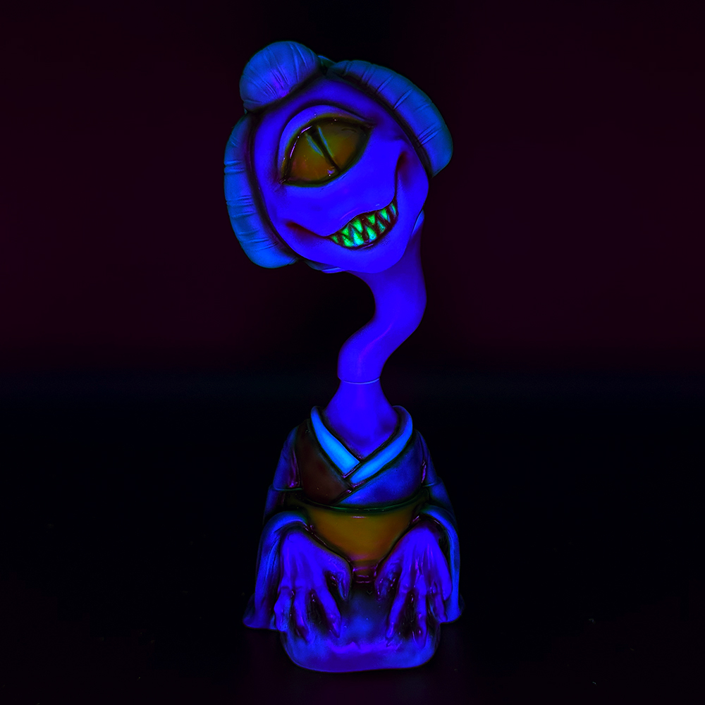 デザフェス Vol.61にて”かこわらメンバーズカード会員限定”で販売されたさちこです🥰 本作は下北沢で開催されたかっこわらい雑貨店さんの個展”MAD UNIVERSE”のメインビジュアルのイラストカラーがそのまま再現された特別な作品となっています😍 ド派手な肌の色が特徴的ですが、絶妙な陰影がゾッとするような怖さも醸し出しています😱 さらにブラックライトを当てると歯がグリーンに… そして僅かですがに眼も少し光ります😲