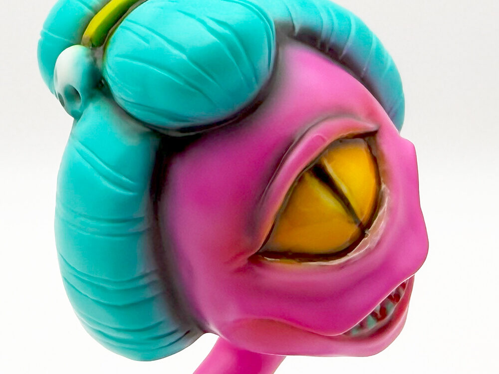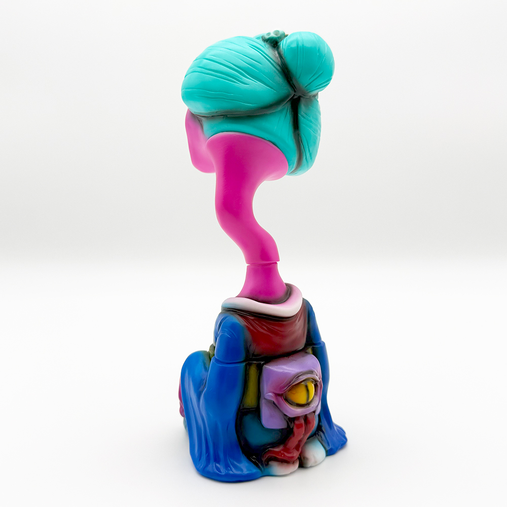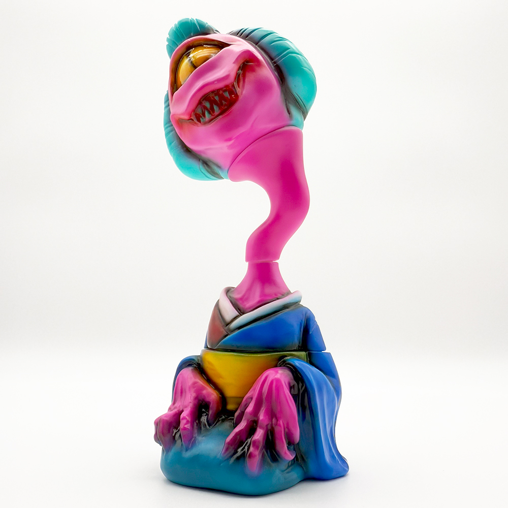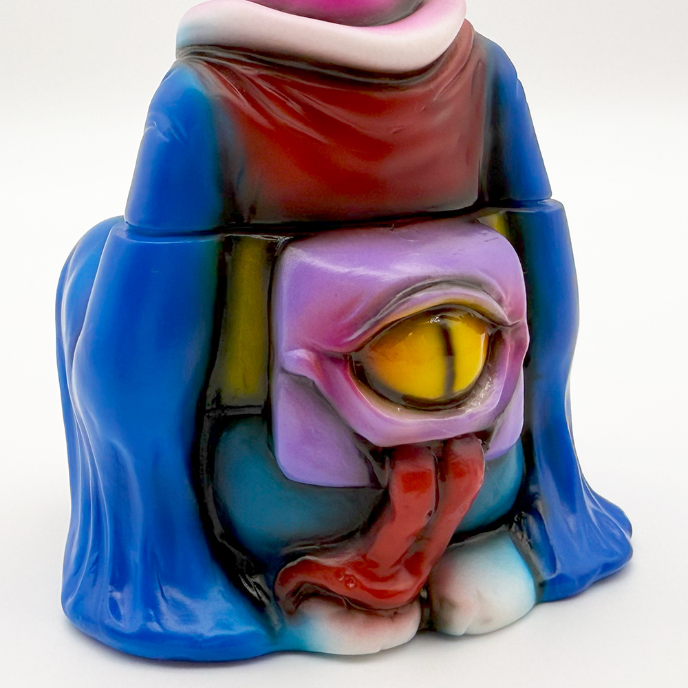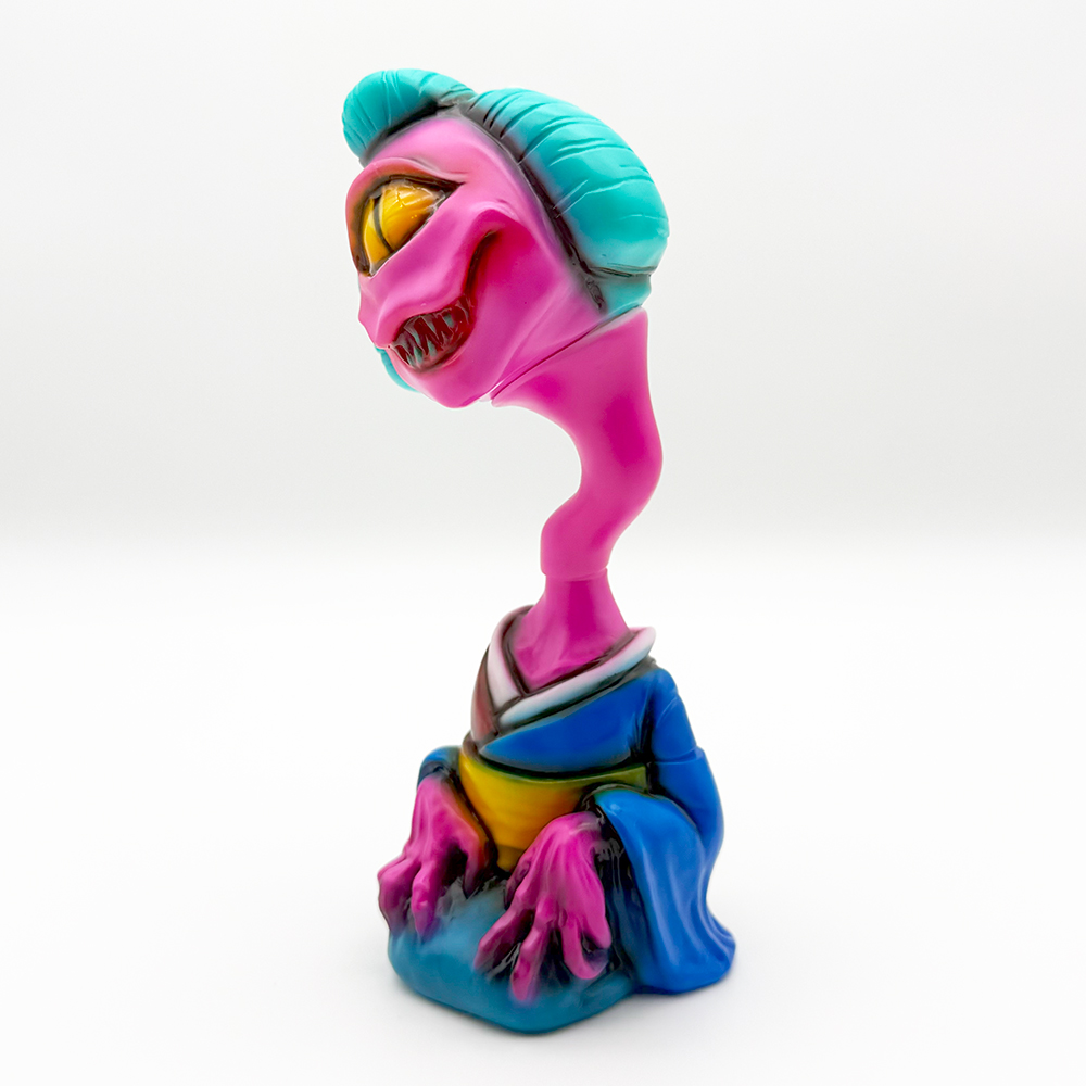 デザフェス Vol.61にて”かこわらメンバーズカード会員限定”で販売されたさちこです🥰 本作は下北沢で開催されたかっこわらい雑貨店さんの個展”MAD UNIVERSE”のメインビジュアルのイラストカラーがそのまま再現された特別な作品となっています😍 ド派手な肌の色が特徴的ですが、絶妙な陰影がゾッとするような怖さも醸し出しています😱 さらにブラックライトを当てると歯がグリーンに… そして僅かですがに眼も少し光ります😲