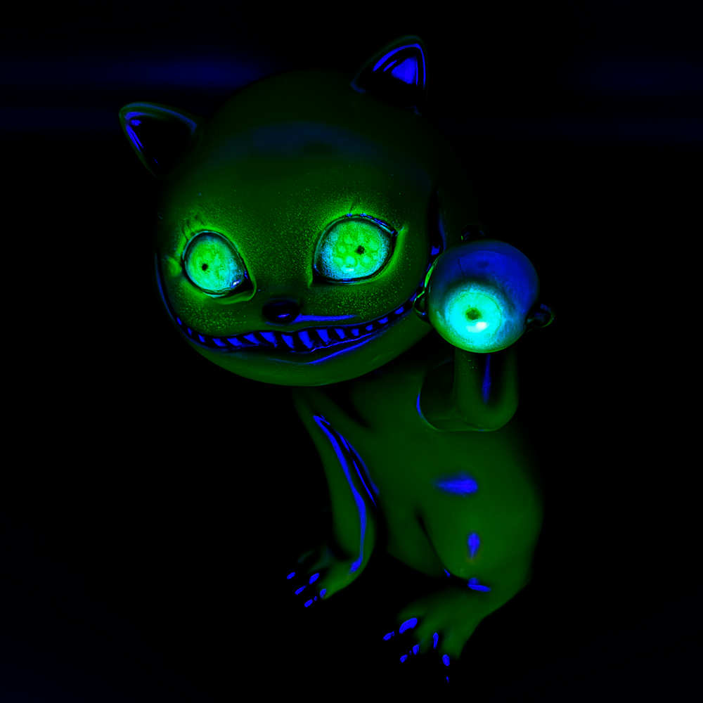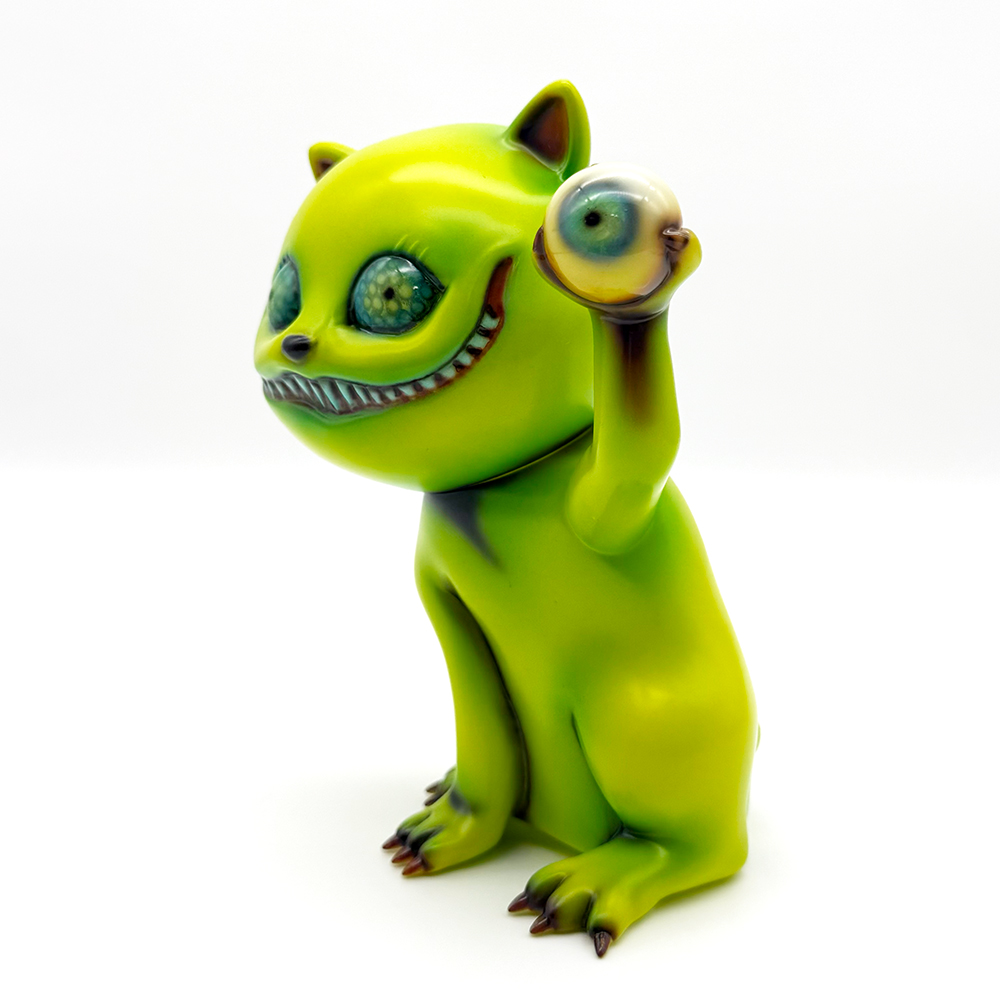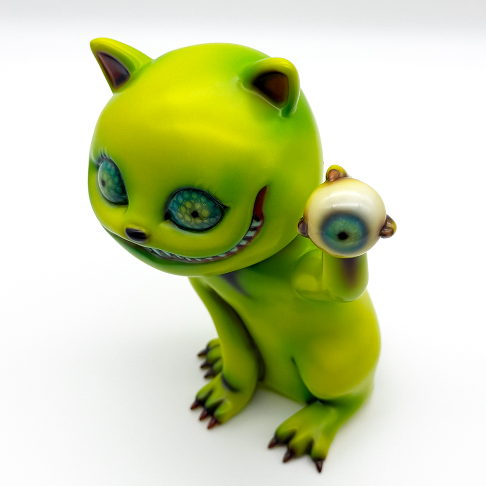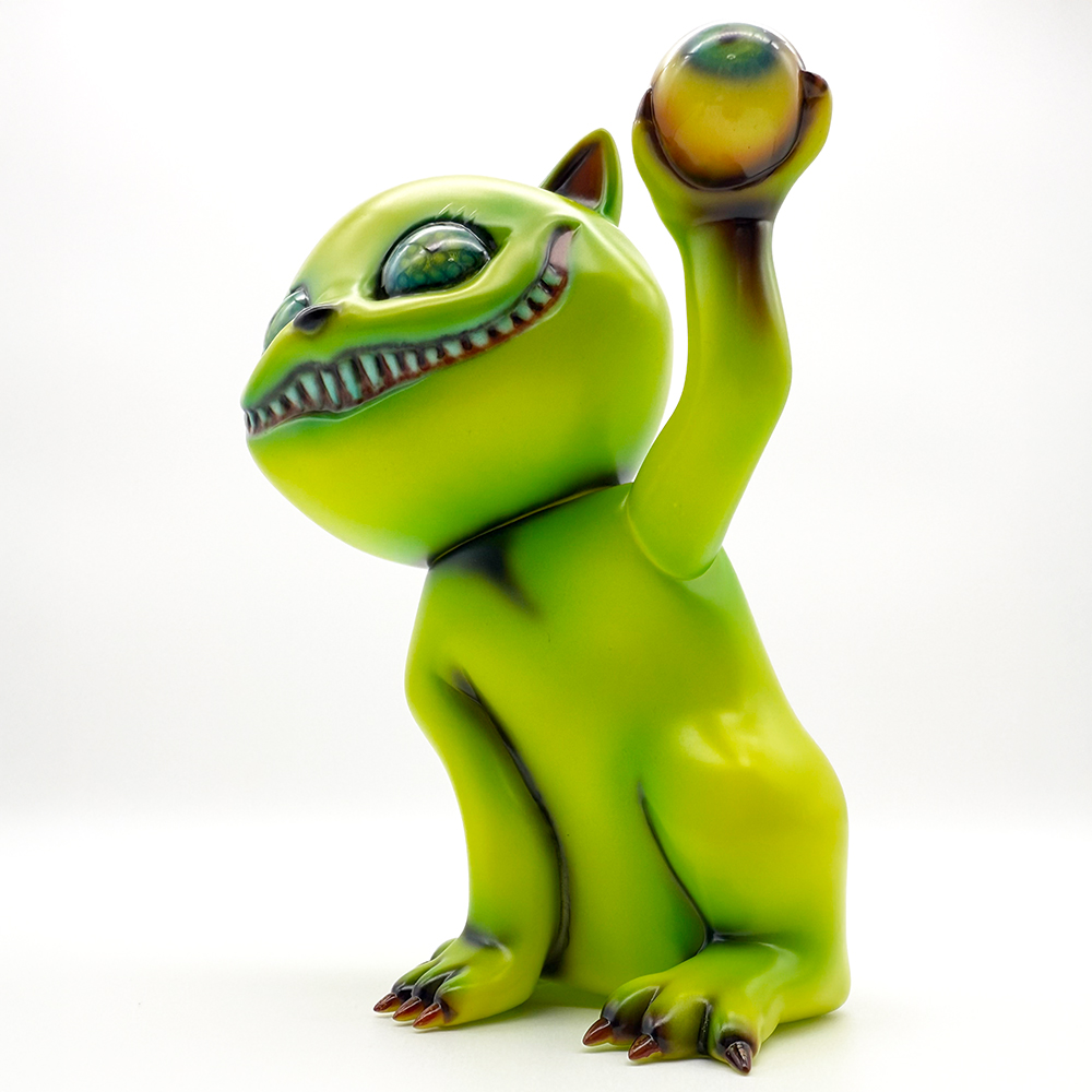 ”ワンコン Vol.5”でお迎えしたタマです🥰 ついに登場!目玉を鷲掴みにしているタマです😲 これにより一気にホラー寄りになり、表情もどこか悪魔的に見える気がしますね😱見開いた眼はエメラルドグリーンでドット柄が施されていることで輝いて見えます✨さらに暗闇でブラックライトを当てると両眼と鷲掴みにした目玉が光ります😊 そしてその光を受けて全身もぼんやりと照らされて、より恐怖感と悪魔的な印象が増してきます😱