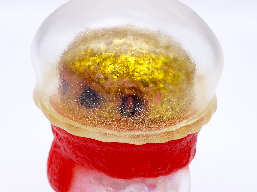 ”ワンフェス2025冬”でお迎えした植田明志さんの”ツキノコ”です🥰 本作がスタンダードカラーで全体が透明であることが特徴です🤔透明なクラゲの傘からは金色の頭部が見え、身体の中にはキラキラ光るミラーホロフィルムが入って虹色に光っています🥰 さらに傘部分には白い塗装が吹き付けられ、より幻想的で柔らかい雰囲気を醸し出しています🤔また可愛い雰囲気のキャラクターですが、3つの目のような黒い穴は金色の頭部とは対照的で怪しさや闇も感じますね😱