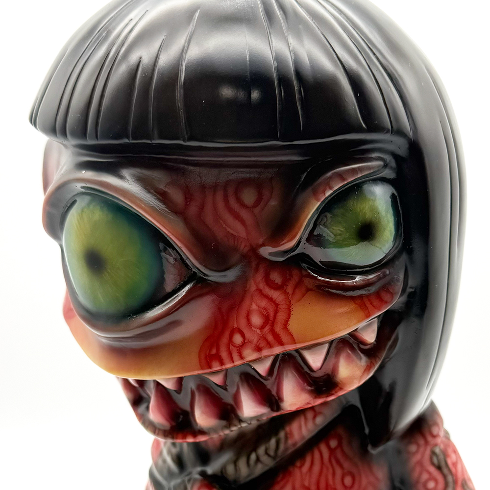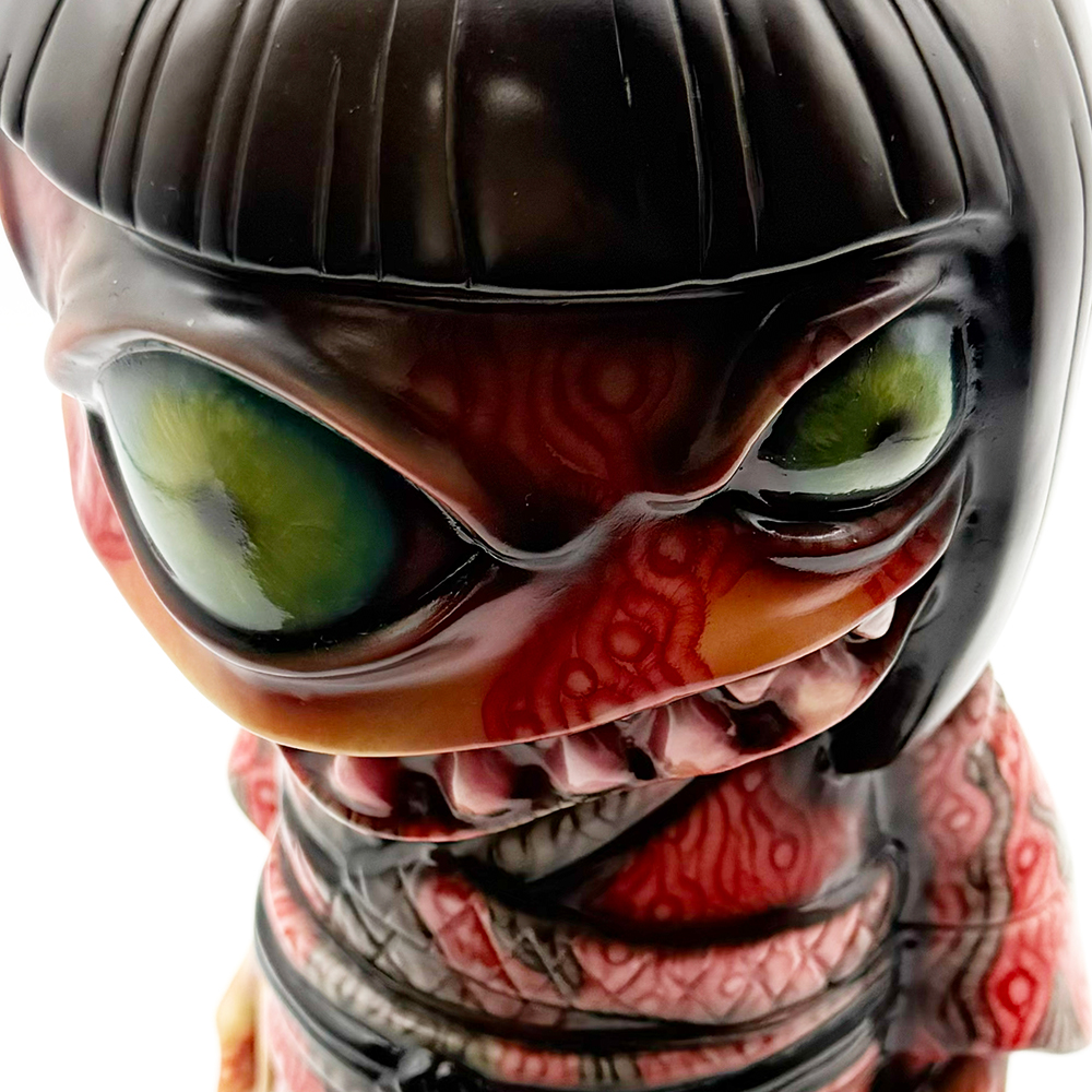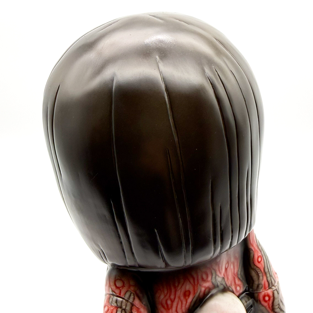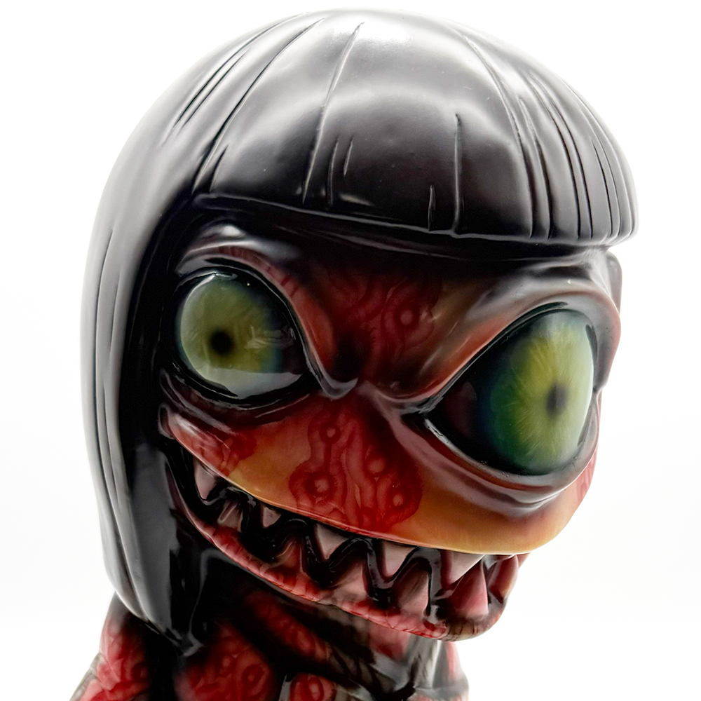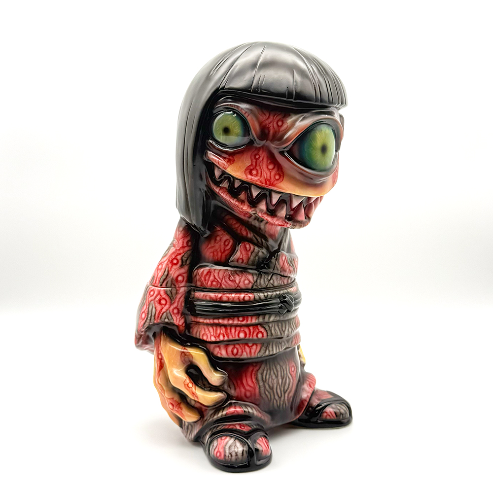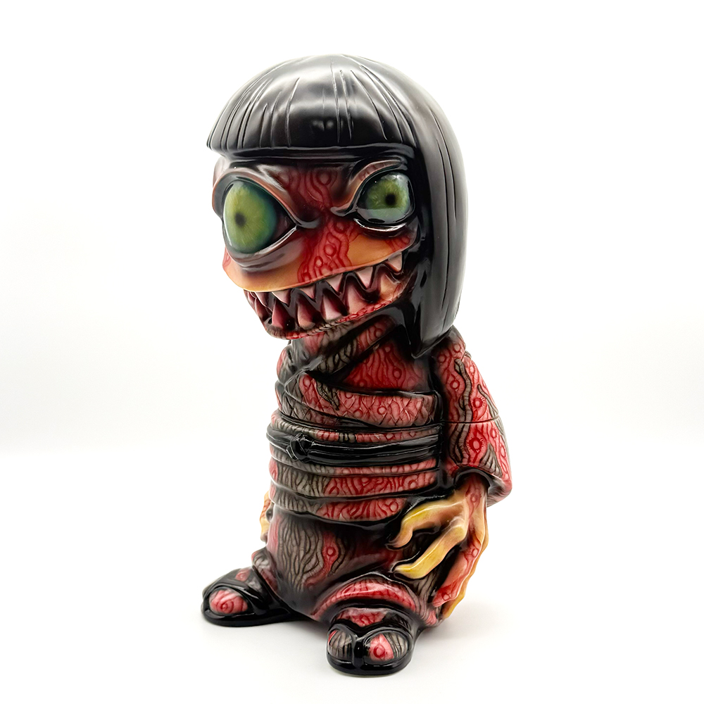 ワンフェス2026冬で販売されたインクレディブルよしこです🥰 黒髪に赤系の着物が映えるよしこ… 赤と黒にこの細かく描かれた模様が血生臭さや炎が燃え盛るイメージで、背中の髑髏の血の跡のような赤味がリアリティを増幅しています😱 さらに顔と手の細かい柄塗装、異様に大きく澄んだ瞳と黒髪の艶感・透明感にもセンスが光ります✨ 全体的に重厚感がハンパなく、細部の塗装にまでこだわった至極の一品… ワンオフに相応しい、素晴らしい作品ですね🥰
