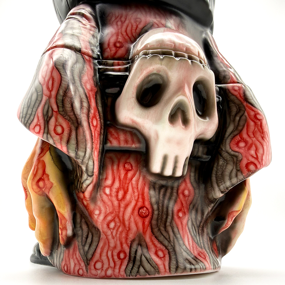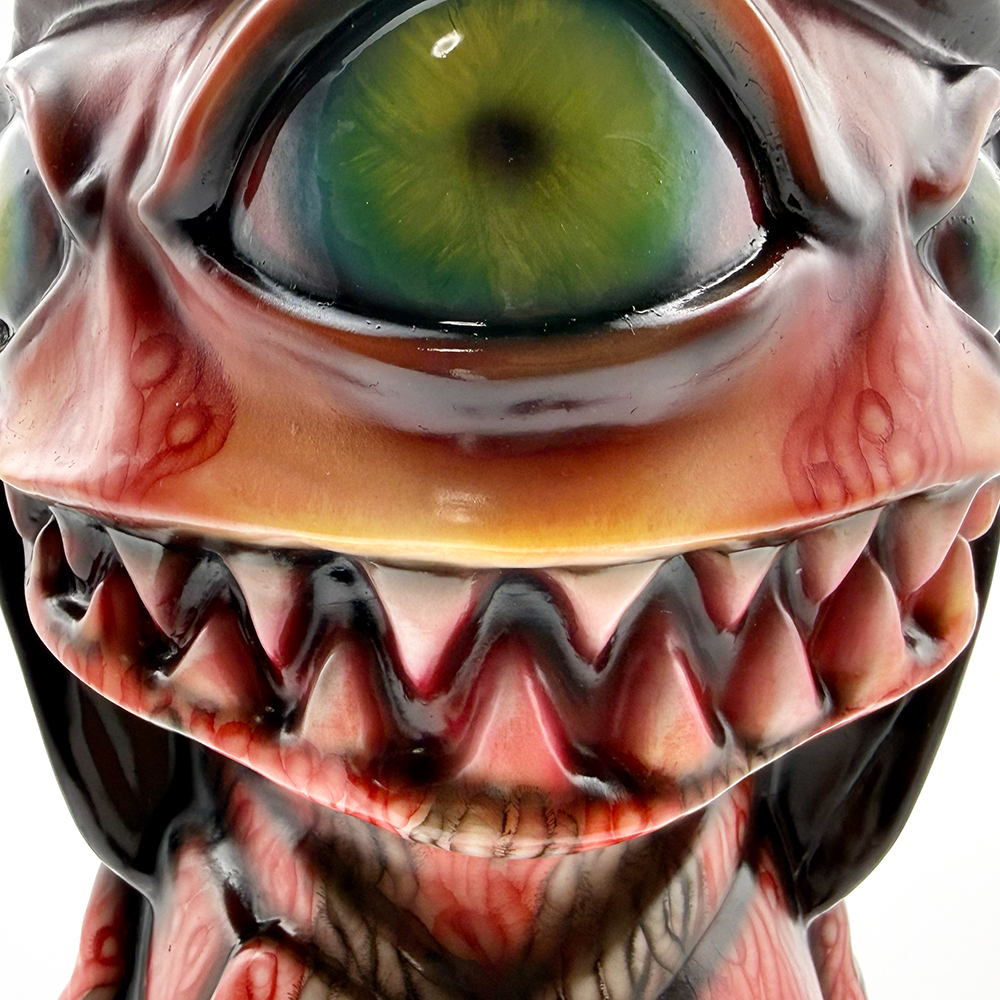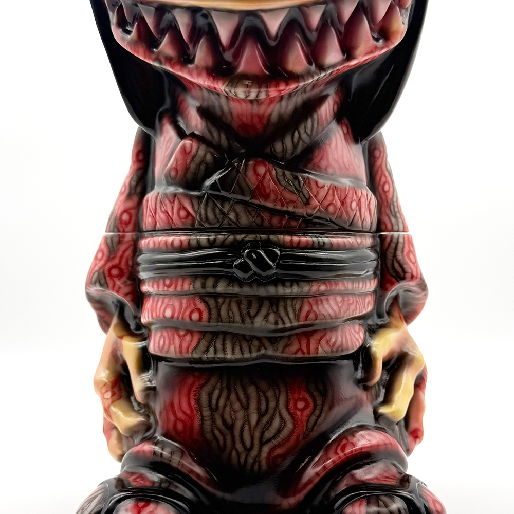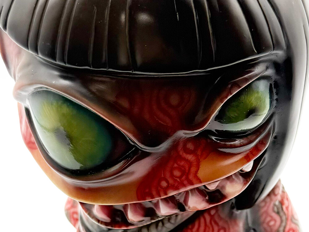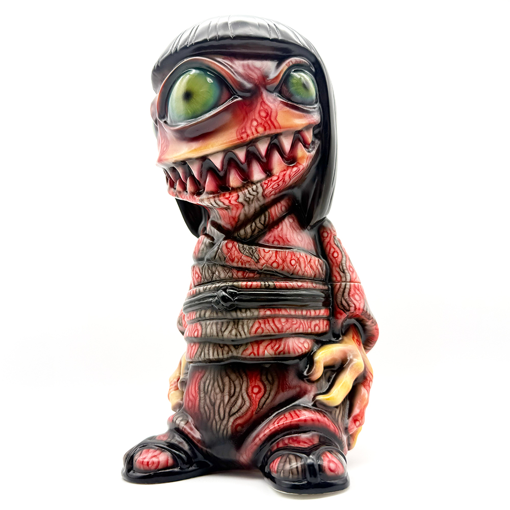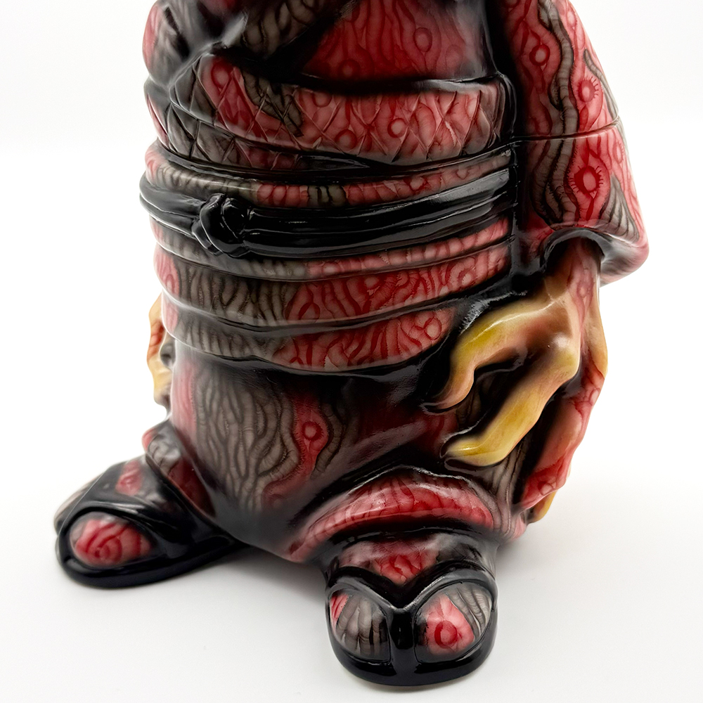 ワンフェス2026冬で販売されたインクレディブルよしこです🥰 黒髪に赤系の着物が映えるよしこ… 赤と黒にこの細かく描かれた模様が血生臭さや炎が燃え盛るイメージで、背中の髑髏の血の跡のような赤味がリアリティを増幅しています😱 さらに顔と手の細かい柄塗装、異様に大きく澄んだ瞳と黒髪の艶感・透明感にもセンスが光ります✨ 全体的に重厚感がハンパなく、細部の塗装にまでこだわった至極の一品… ワンオフに相応しい、素晴らしい作品ですね🥰